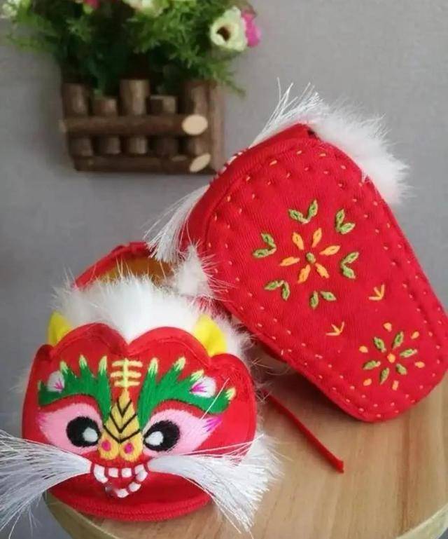 虎头靴的制作工艺复杂,需手工缝制,常用刺绣、拨花、打籽等针法;靴面多以红、黄为主色调,虎眼、虎嘴等部位用粗线勾勒,以夸张手法凸显威猛感。部分款式还会用染色兔毛在虎耳、虎口、虎眼等处镶边,增添质感与灵动性。 靴身缝有红丝带,孩童穿上后更显大方富贵、精神活泼,惹人喜爱。