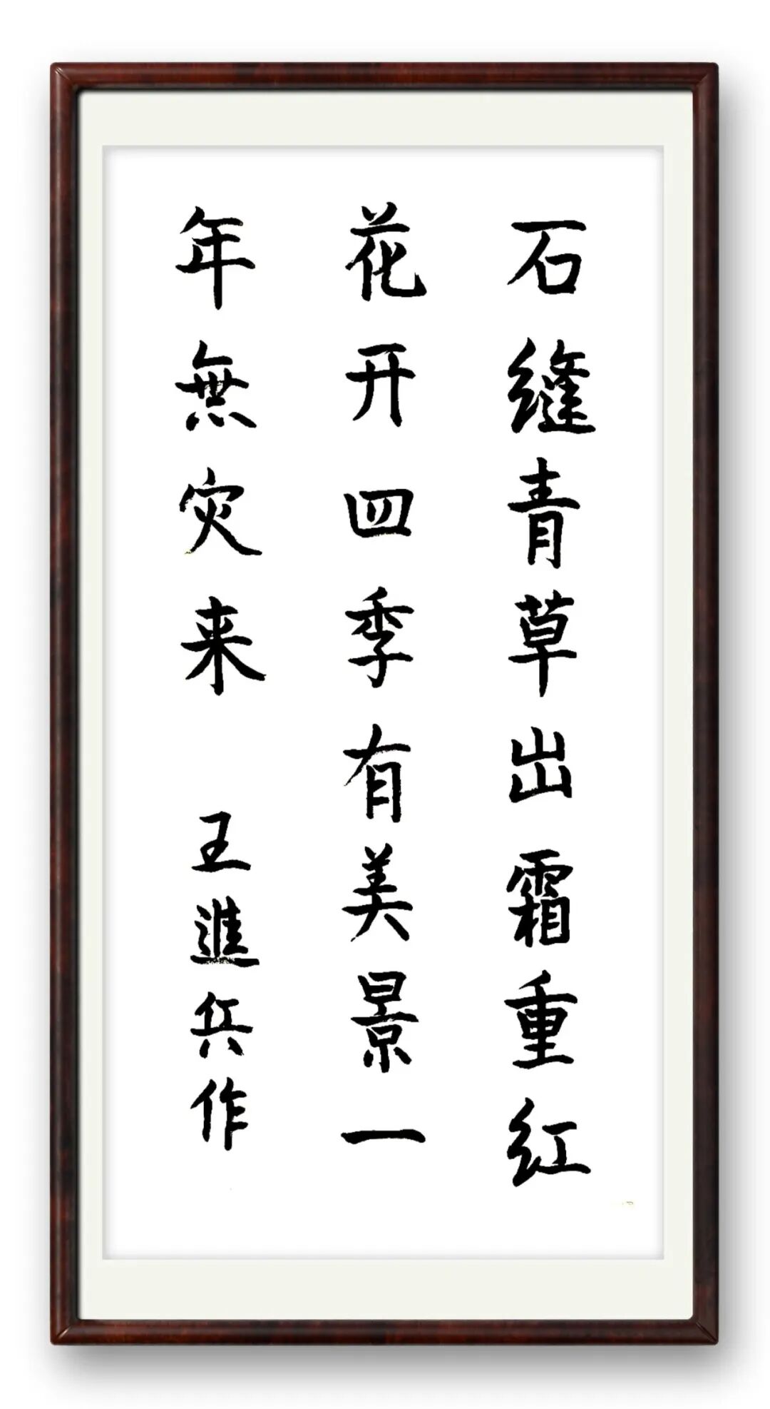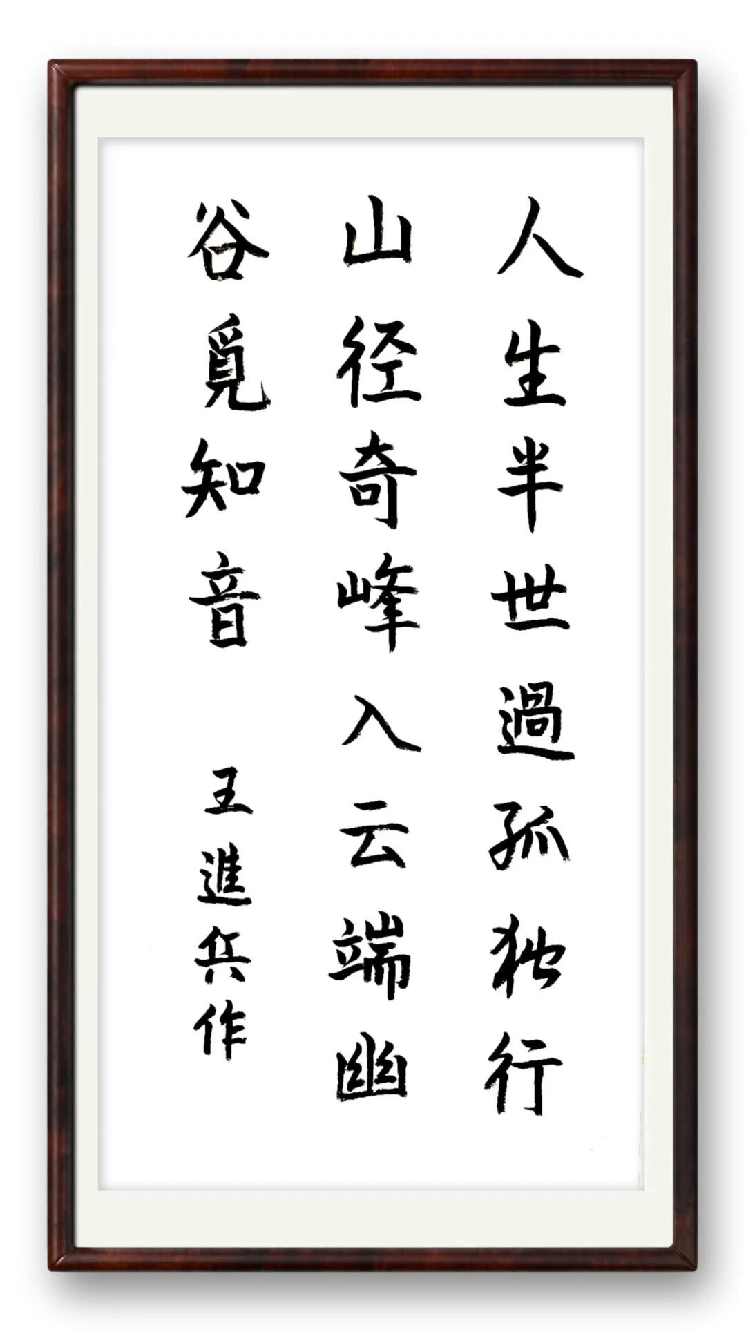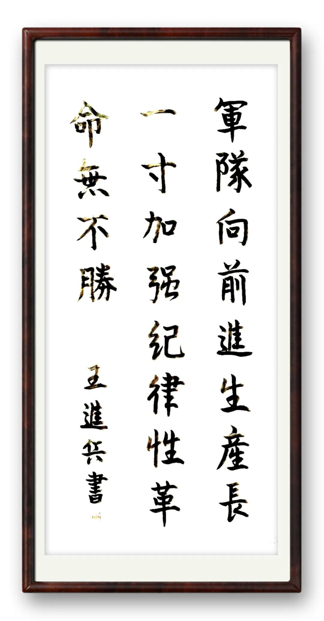 好的书法,贵在“字外功夫”,这是书家学识、品格与阅历的综合体现。王进兵先生常年身处重要岗位,见惯人间烟火却坚守心中底线,这份独特阅历让他的书法多了一份现实温度与精神高度。他不追求笔墨炫技,以朴素笔墨书写真挚情怀;不刻意彰显风格,却在一笔一画间形成独有的笔墨语言——沉稳中见灵动,端庄中见洒脱。
