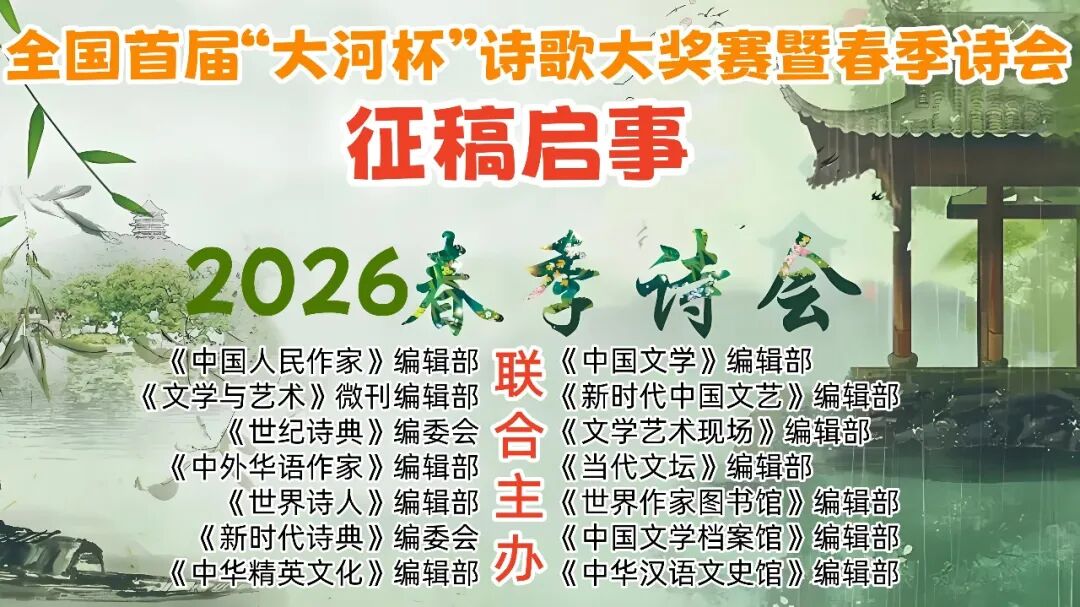 应广大作者的强烈要求,现经《文学与艺术》《世纪诗典》《中外华语作家》《世界诗人》《新时代诗典》五大微刊、《中国人民作家》《中华精英文化》《中国文学》《新时代中国文艺》《当代文坛》五大头条和《世界作家图书馆》《中国文学档案馆》《中华汉语文史馆》三大馆编辑部研究,决定联合举办全国首届“大河杯”诗歌大奖赛暨春季诗会征稿,开始面向海内外作家、诗人征集诗歌作品,欢迎来稿。