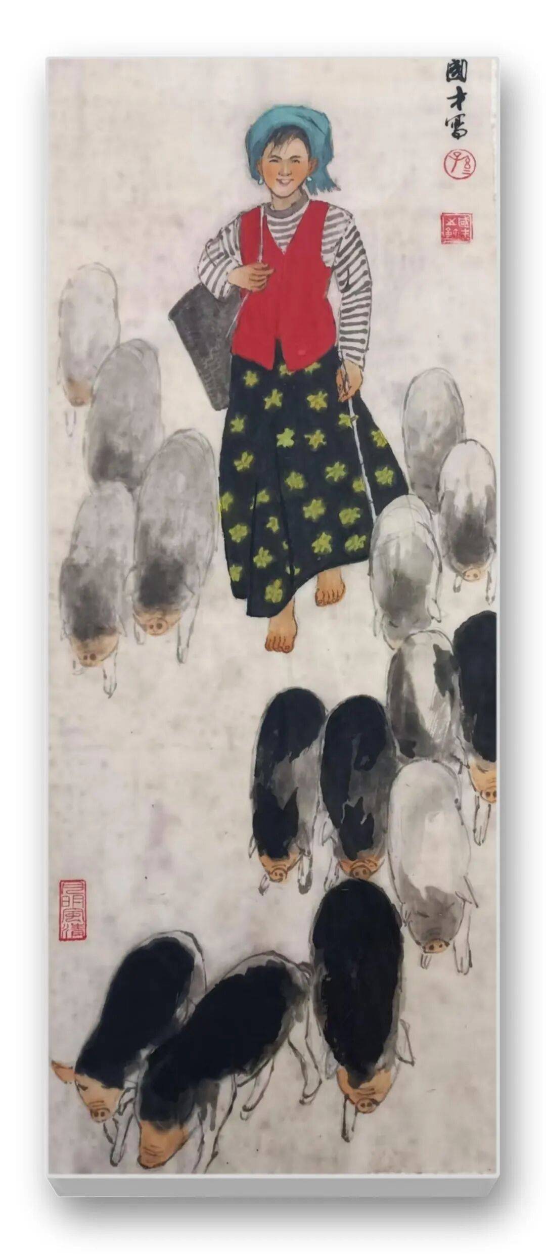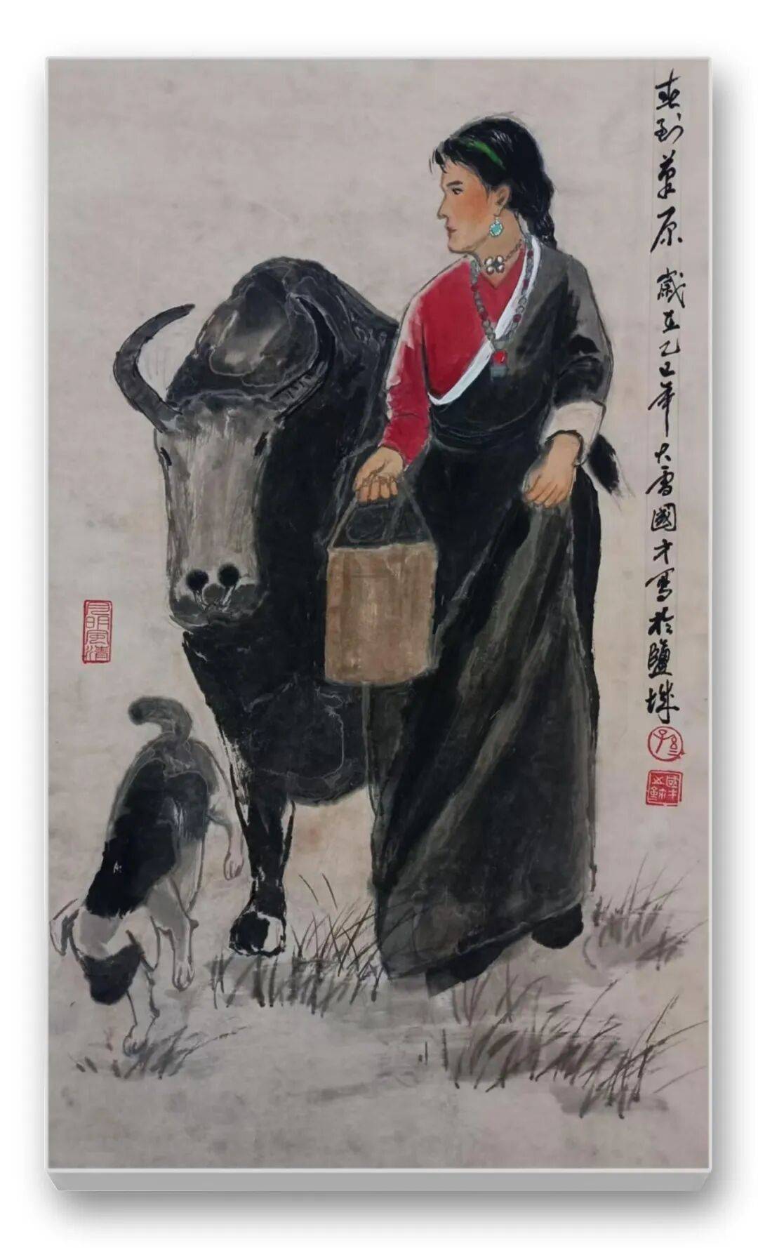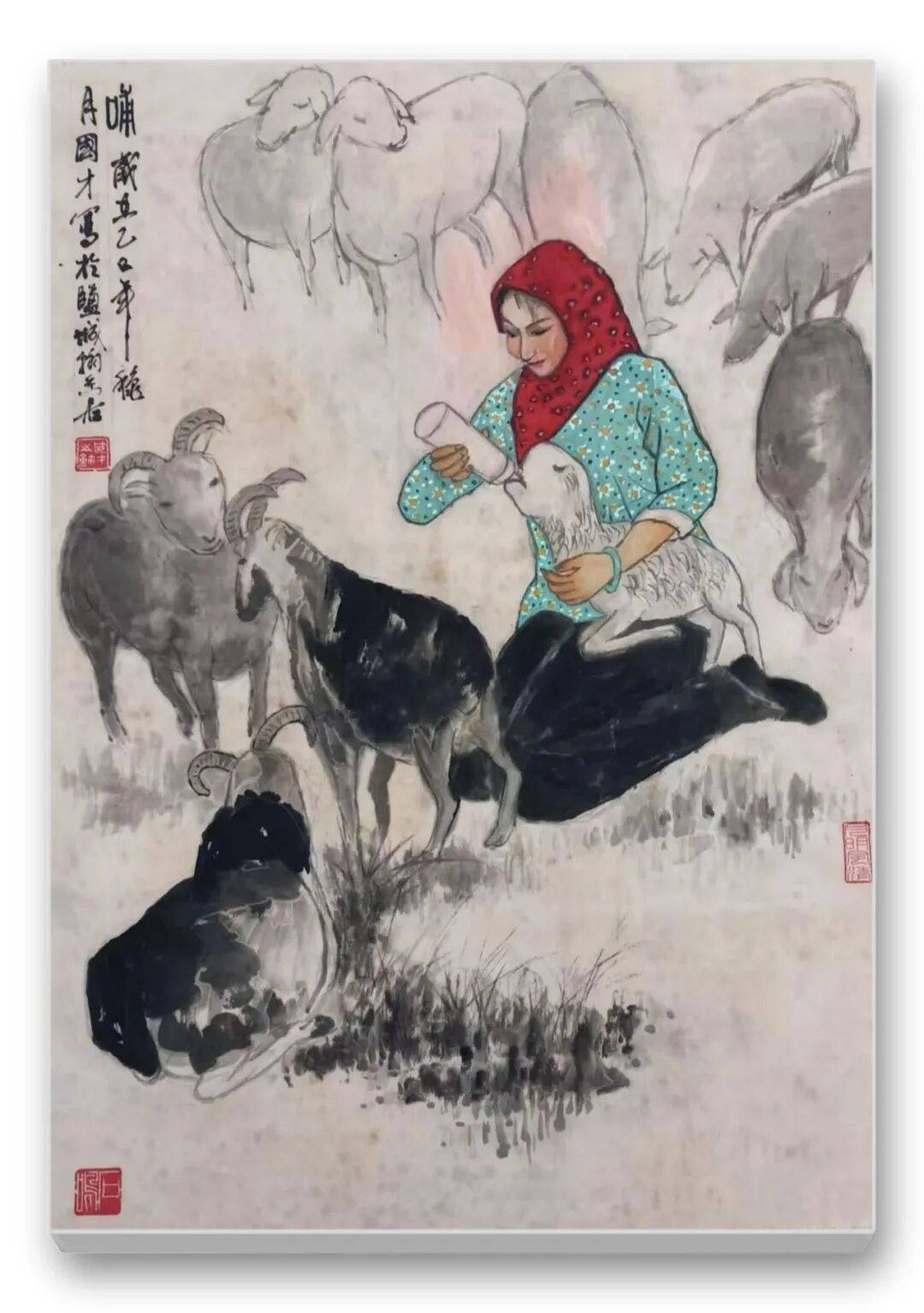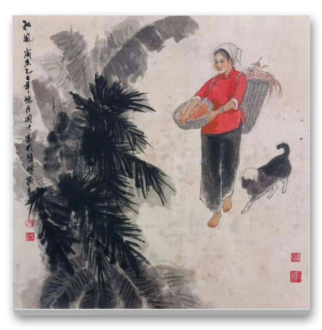 色彩的运用是先生作品的另一大亮点。他突破传统水墨“淡彩为主”的局限,大胆运用鲜明而和谐的色彩,彰显民族文化的绚烂与生活的热烈。藏族妇女的红袍、彝族少女的彩裙、江南农妇的蓝衫,皆以明快的色彩点染,与水墨的黑白灰形成强烈对比,却又和谐相融。如《和风》中红衣女子手提果篮,在墨色芭蕉的映衬下,既点亮了画面,又凸显了人物的鲜活生命力;《牧羊图》中女子的红头巾与蓝底花衫,与羊群的洁白、草原的苍茫形成视觉张力,传递出高原生活的质朴与热烈。这种“艳而不俗、浓而不燥”的色彩运用,既符合民族审美,又赋予作品现代视觉感染力。