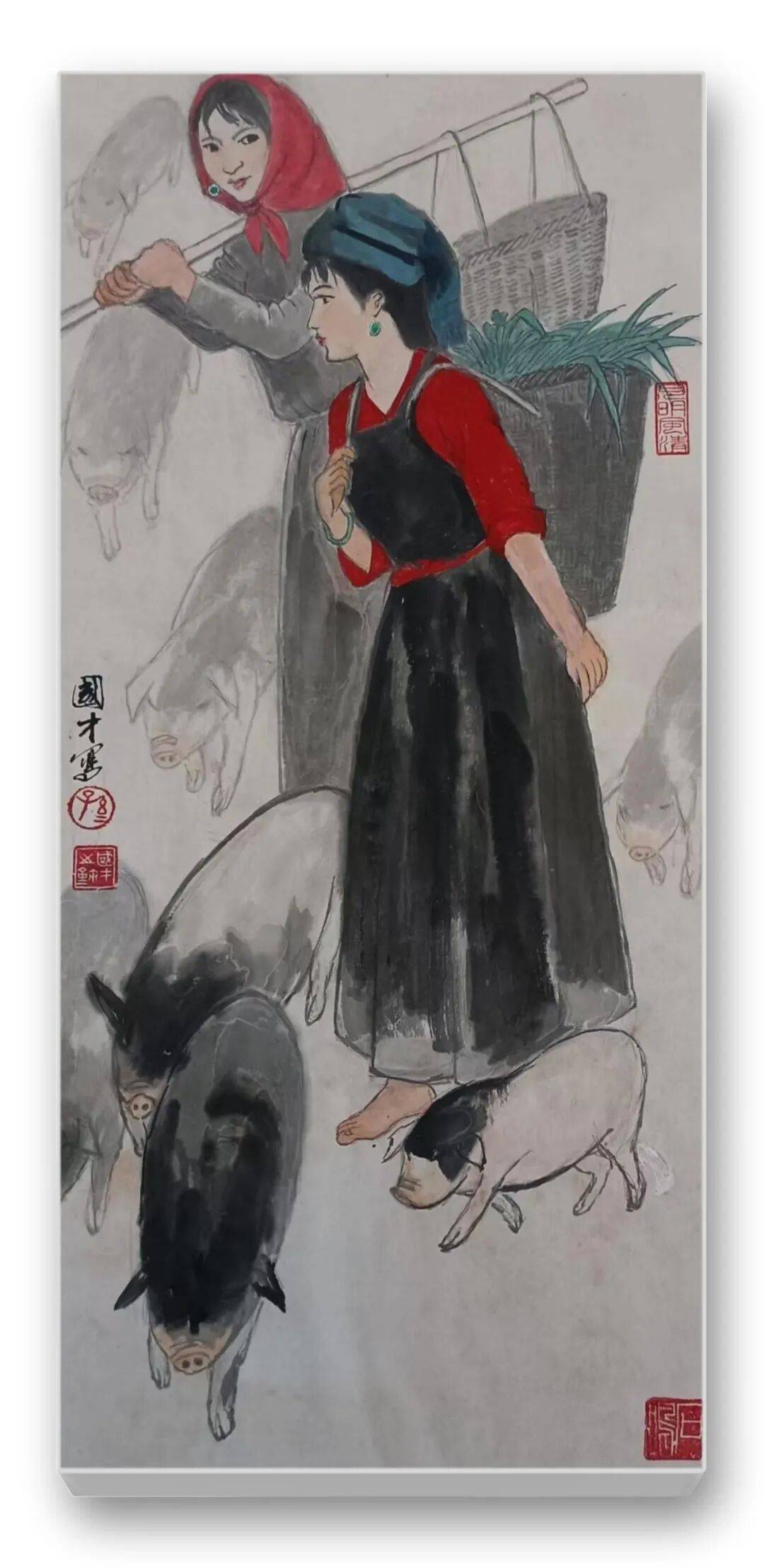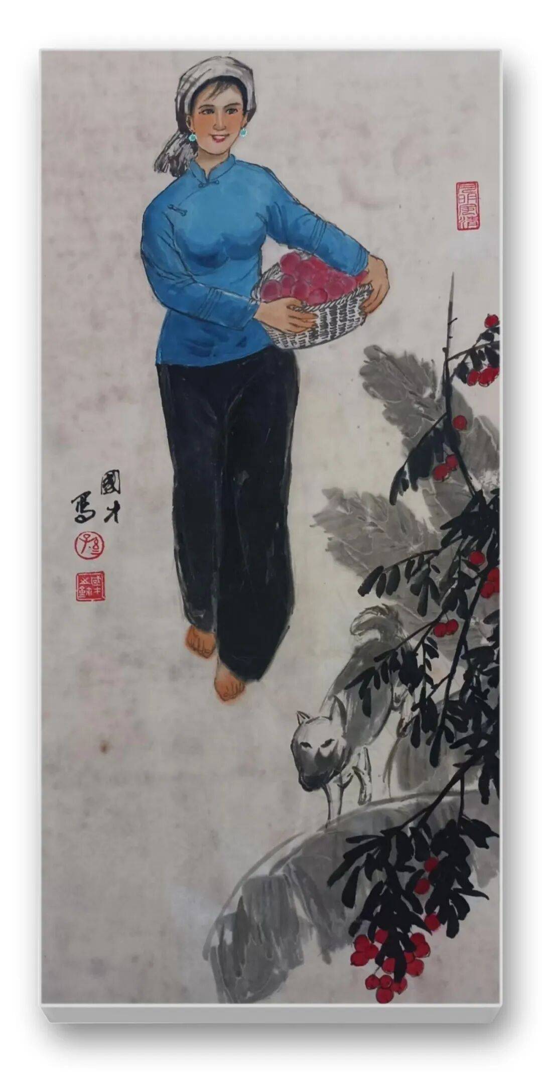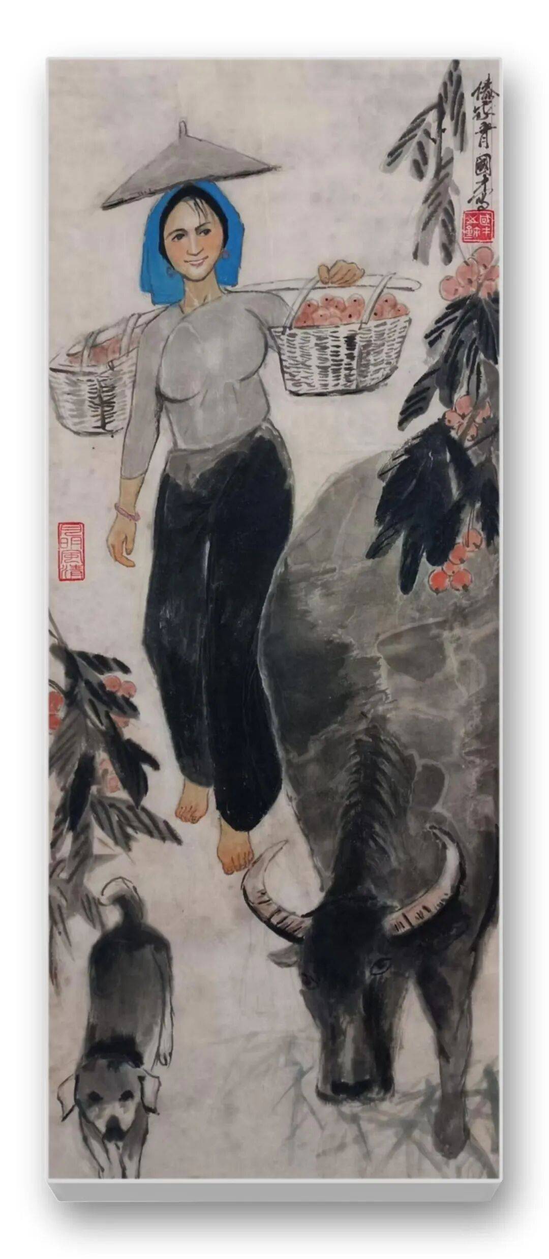 色彩的运用是先生作品的另一大亮点。他突破传统水墨“淡彩为主”的局限,大胆运用鲜明而和谐的色彩,彰显民族文化的绚烂与生活的热烈。藏族妇女的红袍、彝族少女的彩裙、江南农妇的蓝衫,皆以明快的色彩点染,与水墨的黑白灰形成强烈对比,却又和谐相融。如《和风》中红衣女子手提果篮,在墨色芭蕉的映衬下,既点亮了画面,又凸显了人物的鲜活生命力;《牧羊图》中女子的红头巾与蓝底花衫,与羊群的洁白、草原的苍茫形成视觉张力,传递出高原生活的质朴与热烈。这种“艳而不俗、浓而不燥”的色彩运用,既符合民族审美,又赋予作品现代视觉感染力。