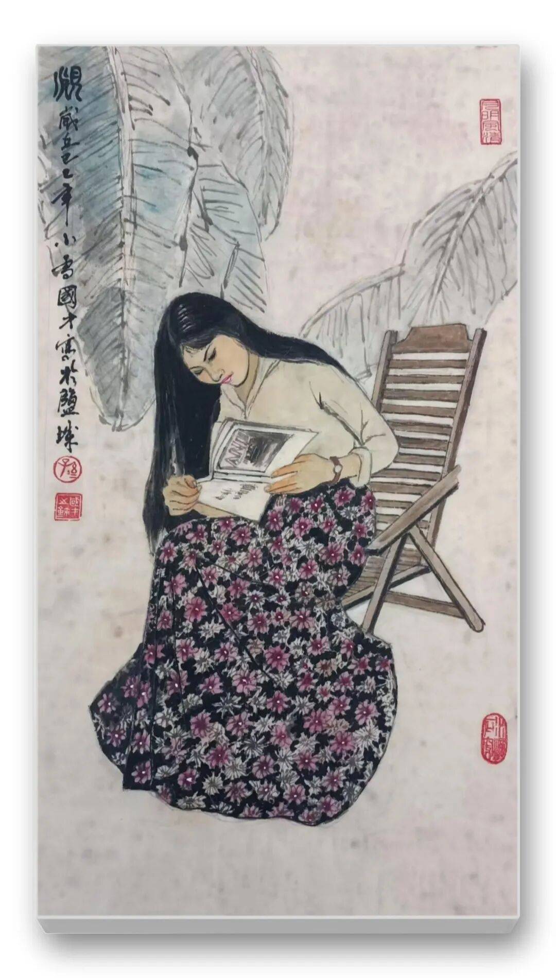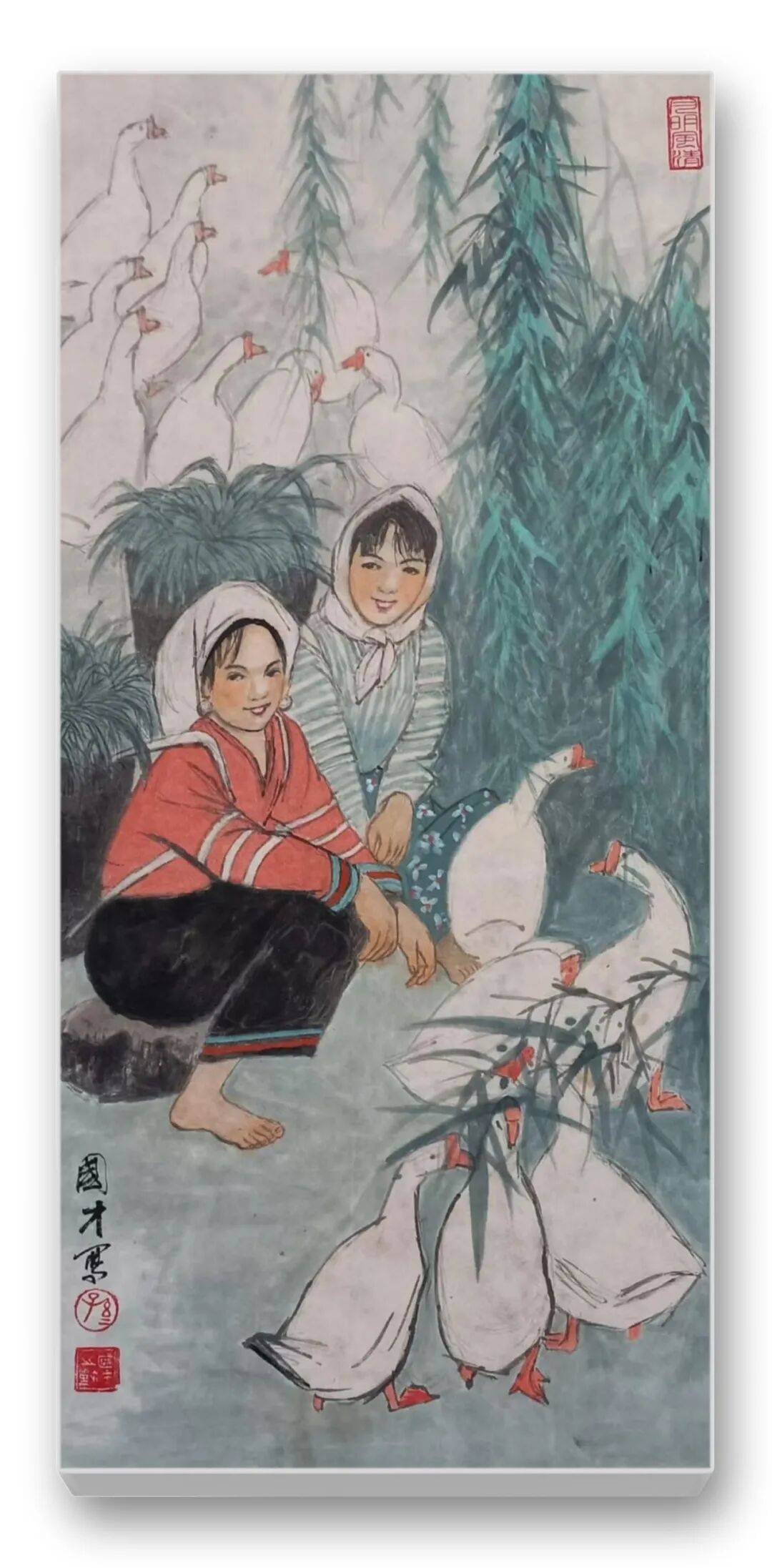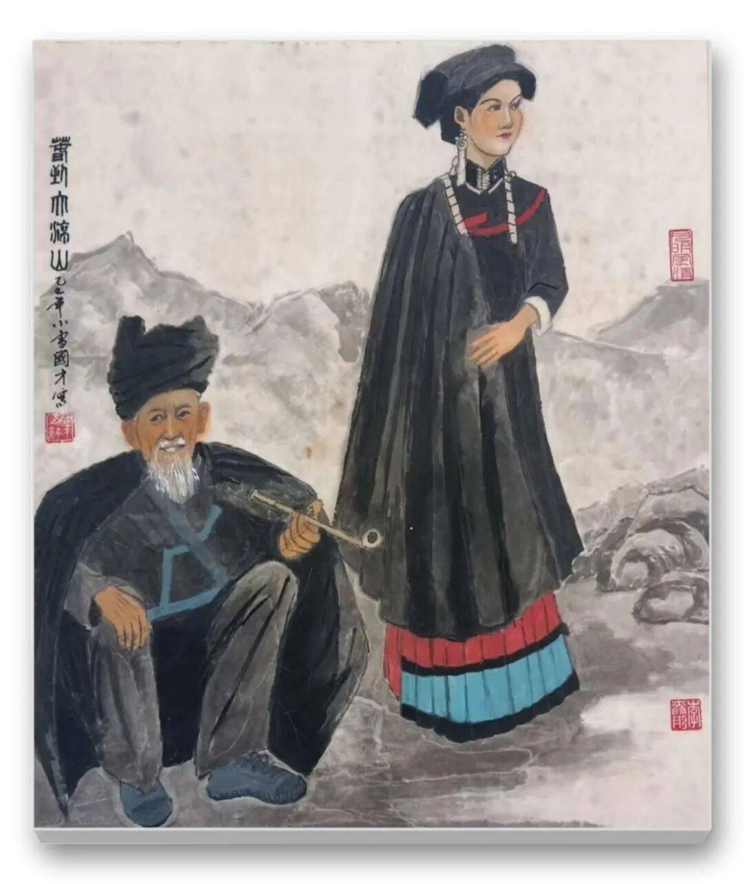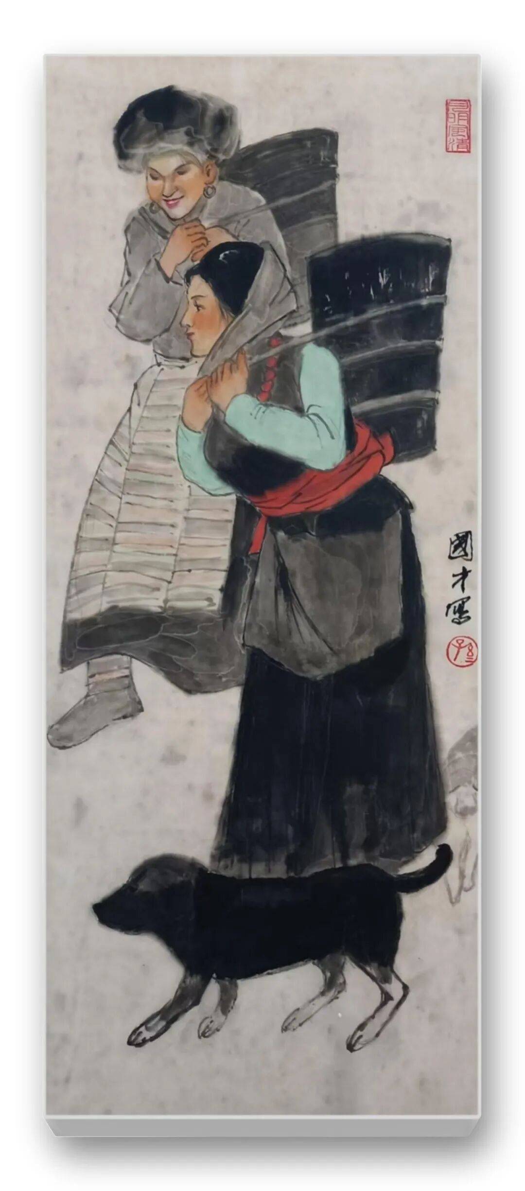 色彩的运用是先生作品的另一大亮点。他突破传统水墨“淡彩为主”的局限,大胆运用鲜明而和谐的色彩,彰显民族文化的绚烂与生活的热烈。藏族妇女的红袍、彝族少女的彩裙、江南农妇的蓝衫,皆以明快的色彩点染,与水墨的黑白灰形成强烈对比,却又和谐相融。如《和风》中红衣女子手提果篮,在墨色芭蕉的映衬下,既点亮了画面,又凸显了人物的鲜活生命力;《牧羊图》中女子的红头巾与蓝底花衫,与羊群的洁白、草原的苍茫形成视觉张力,传递出高原生活的质朴与热烈。这种“艳而不俗、浓而不燥”的色彩运用,既符合民族审美,又赋予作品现代视觉感染力。