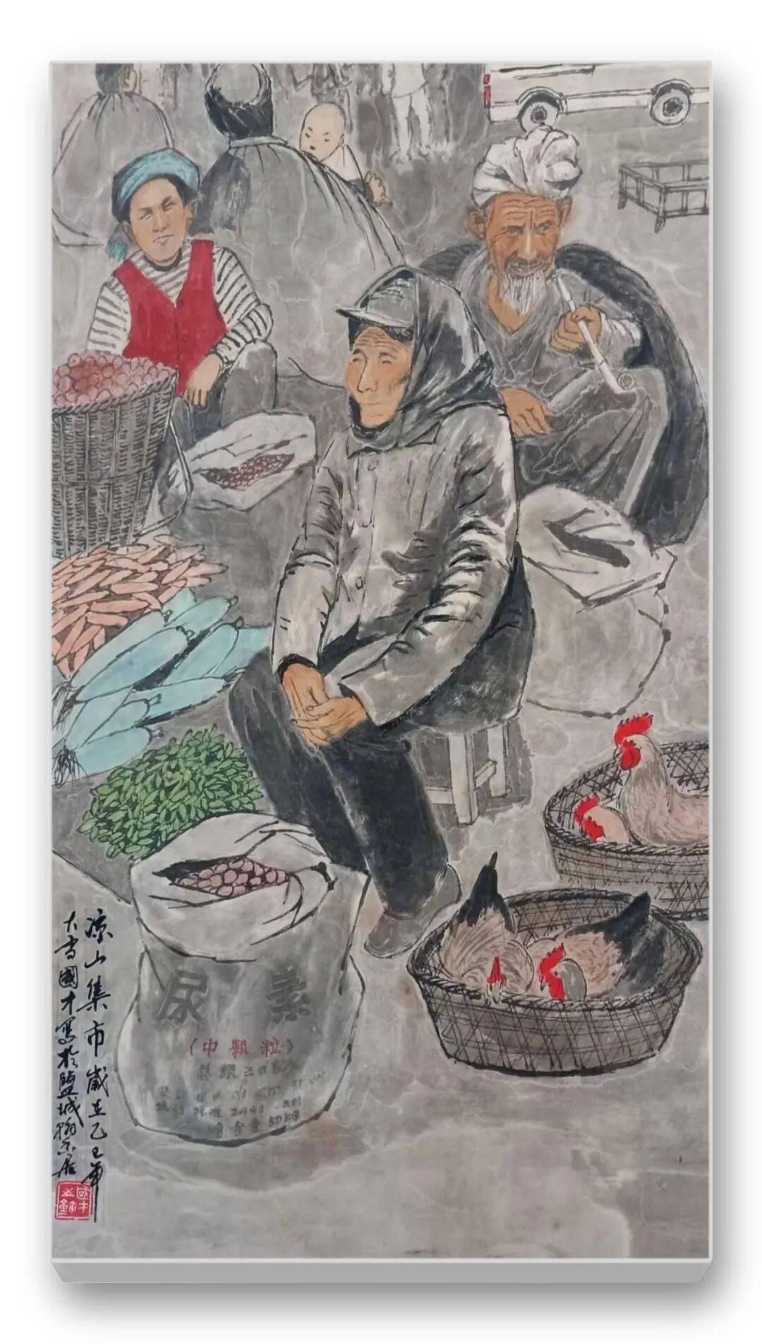 艺术的生命力源于对生活的深度凝视,孙国才先生的创作始终坚守“生活是创作的唯一源泉”这一准则。他常年深入西藏、凉山等少数民族聚居地,亦深耕江南乡土,将自己的足迹印在田间地头、草原牧场与集市街巷,把对土地的热爱、对百姓的共情,化作笔下流淌的笔墨。在他的作品中,没有宏大叙事的刻意铺陈,没有矫揉造作的形式堆砌,只有最朴素的生活场景:《牧牛图》中身着红蓝服饰的少女与水牛相依而行,神情恬淡;《小憩》里藏族妇女围坐麦田,铜壶茶碗间尽显劳作后的从容;《凉山集市》中商贩的吆喝、家禽的鲜活,将市井烟火气凝于尺幅之间。