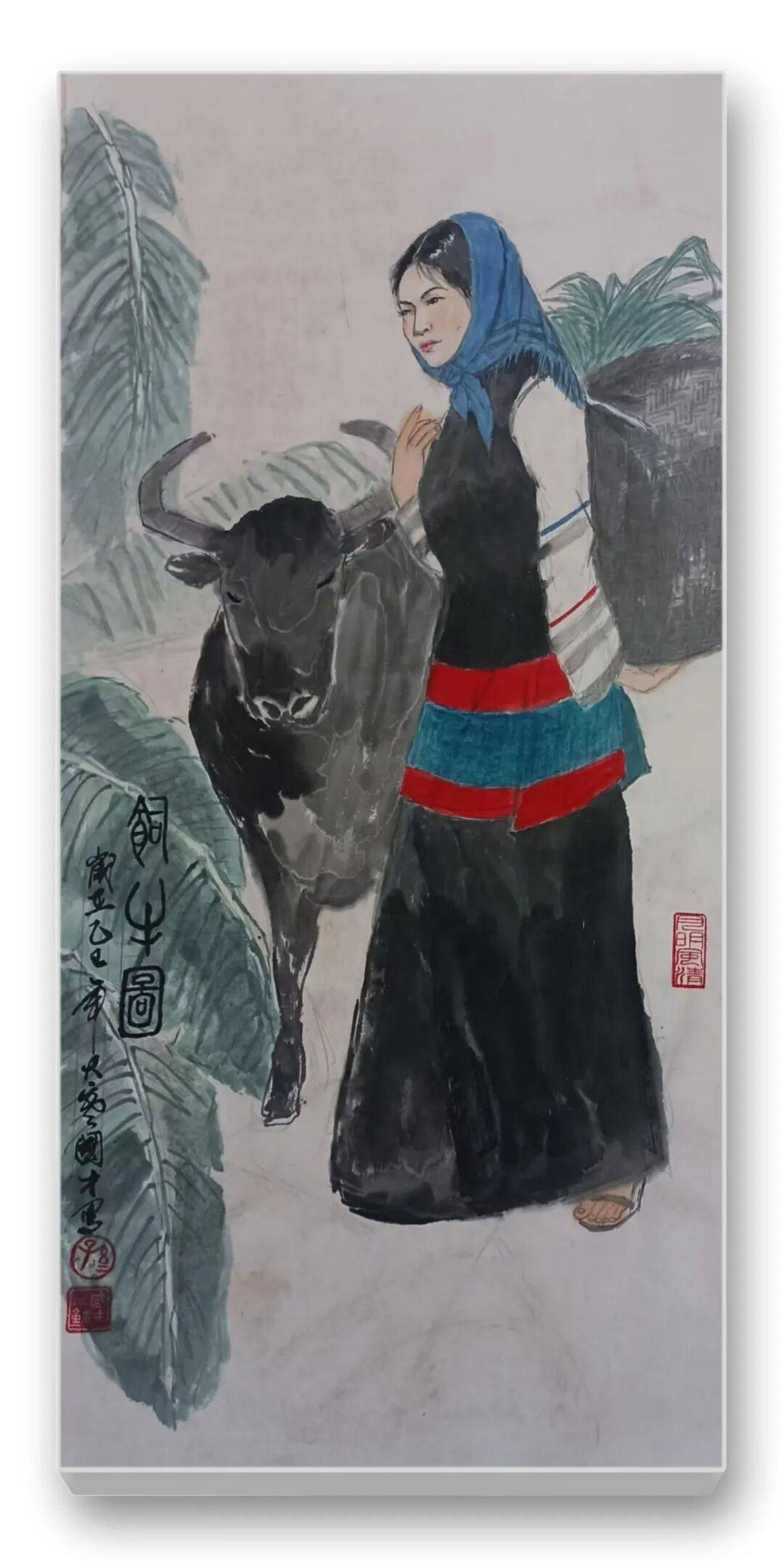墨法的运用上,先生擅长以墨色的浓淡干湿焦营造空间层次与质感。画中的水牛以浓墨积染,尽显身躯的厚重与肌理;芭蕉、竹林以淡墨晕染,兼具写意的洒脱与写实的生动;背景的留白则遵循“计白当黑”的传统理念,或为苍茫高原,或为澄澈水乡,给人以无限遐想。尤为精妙的是,他将西方光影处理技巧融入水墨创作,在人物面部、服饰褶皱处施以淡墨晕染,既保留了水墨的温润质感,又增强了画面的立体感与真实感,使人物形象更具血肉之感。