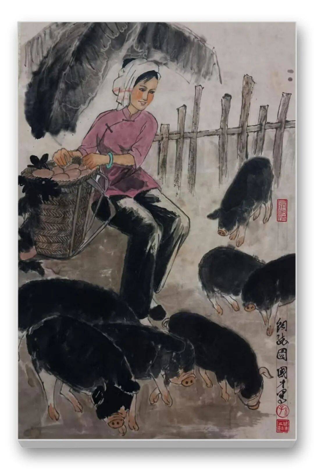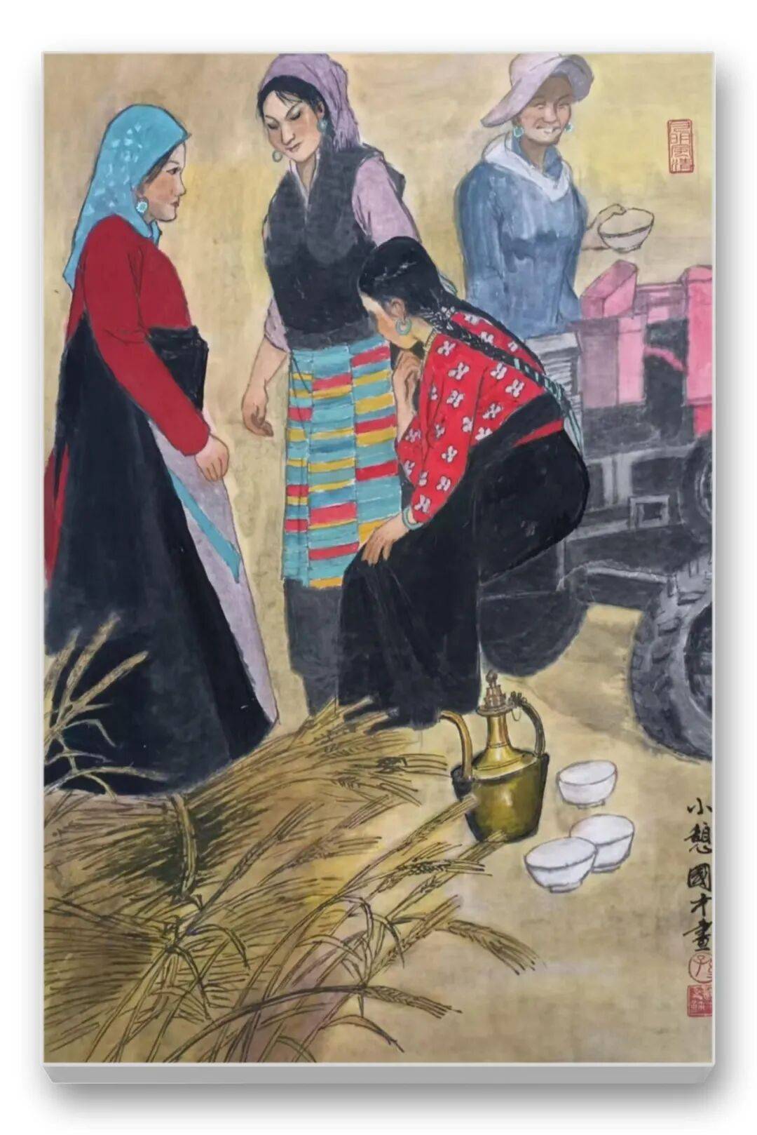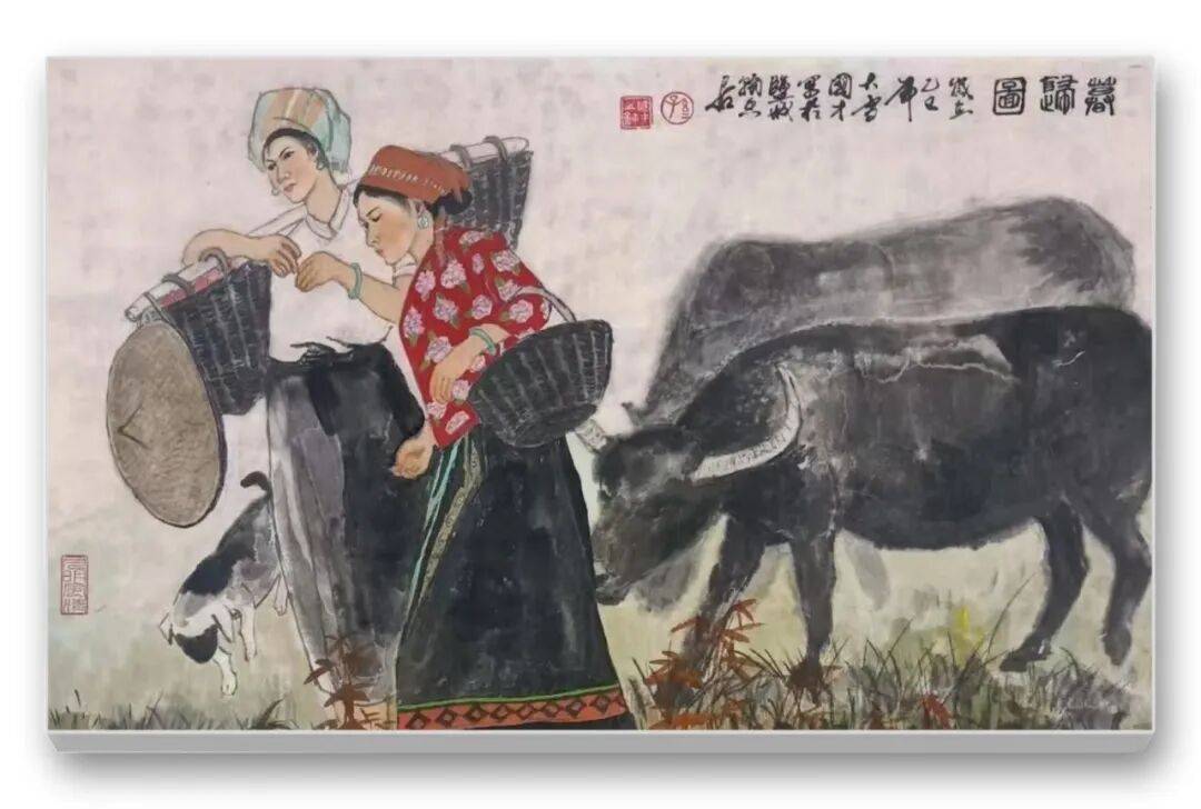 尤为可贵的是,先生的作品始终蕴含着对“劳动之美”的歌颂与对“平凡生命”的尊重。无论是《暮归图》中结伴而归的农妇与水牛,还是《饲鸡图》中女子喂鸡的温和,亦或是《秋收》中满载而归的喜悦,都在诉说着劳动的价值与生活的美好。画中人物没有惊天动地的壮举,却以日复一日的劳作诠释着生命的坚韧;没有华丽的服饰,却以质朴的笑容传递着内心的富足。这种对平凡生命的礼赞,超越了地域与民族的界限,引发观者的深层共情。