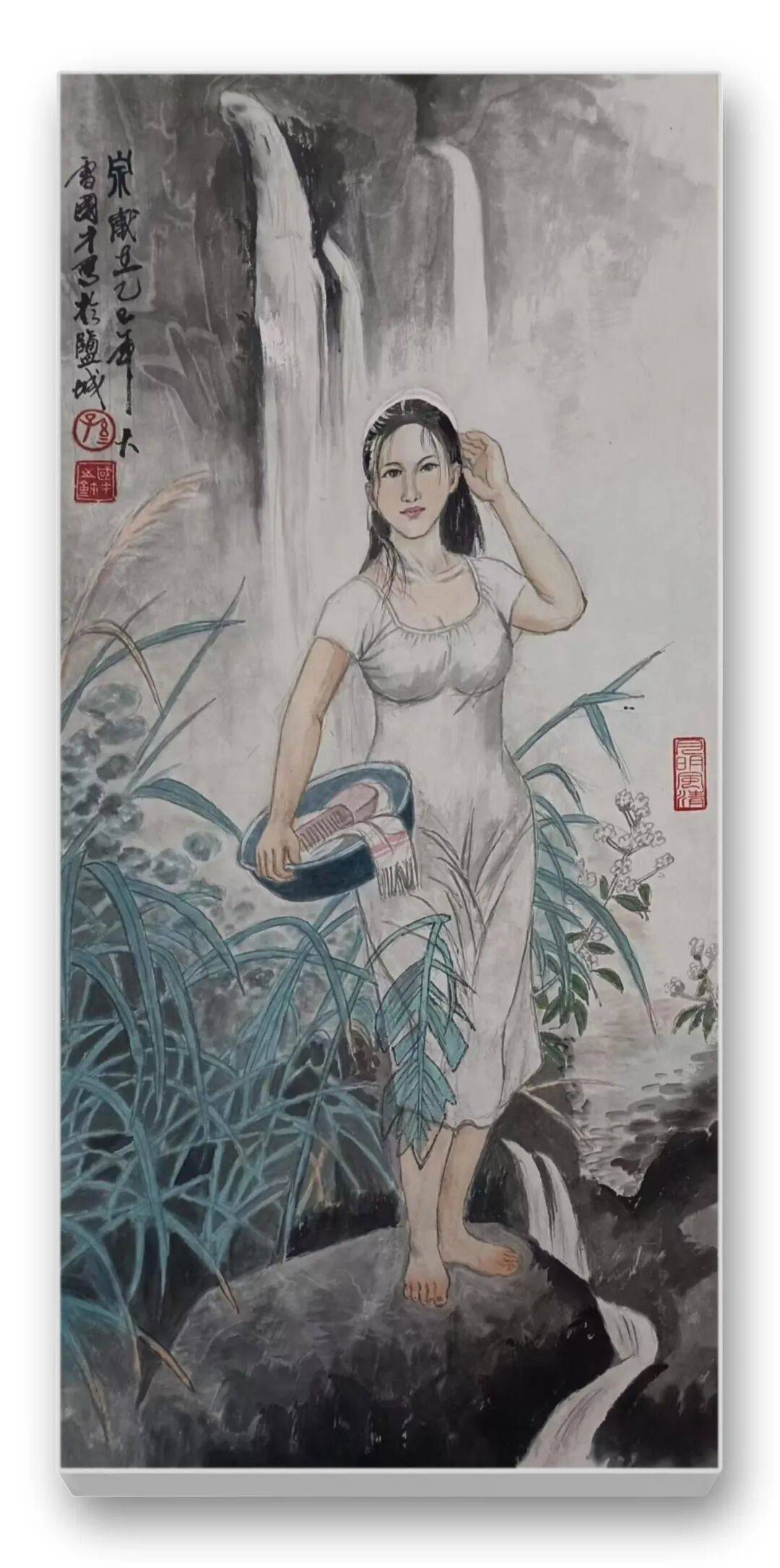 孙国才先生的艺术语言,是传统水墨精神与现代造型理念的完美融合,形成了“工写兼备、墨色共生”的独特风格。在笔墨运用上,他深谙传统国画“骨法用笔”的精髓,线条或刚劲有力,或婉转流畅,兼具书写性与造型性。画中人物的轮廓以凝练的线条勾勒,寥寥数笔便精准把握形体特征;服饰的纹理、植物的枝叶则以多变的线质表现,粗线显厚重,细线见灵动,如《春到大凉山》中彝族女子的百褶长裙,以疏密有致的线条勾勒出层次与动感,既符合服饰的地域特色,又彰显笔墨的韵律之美。