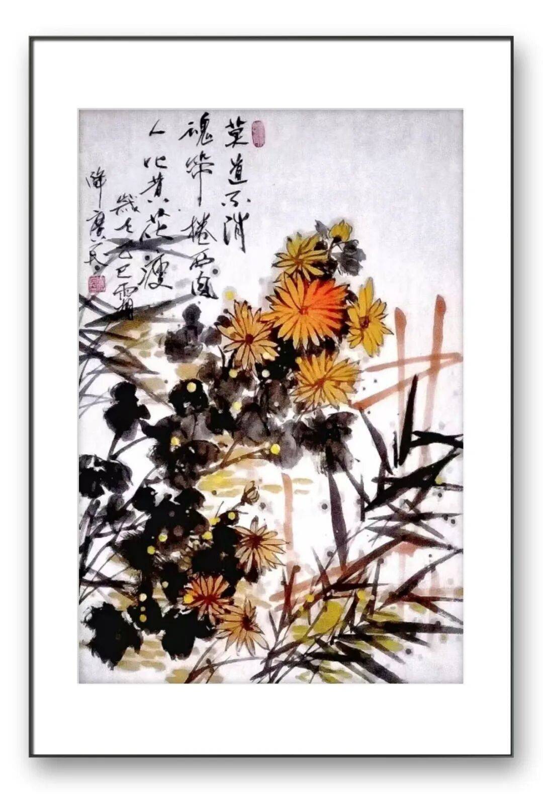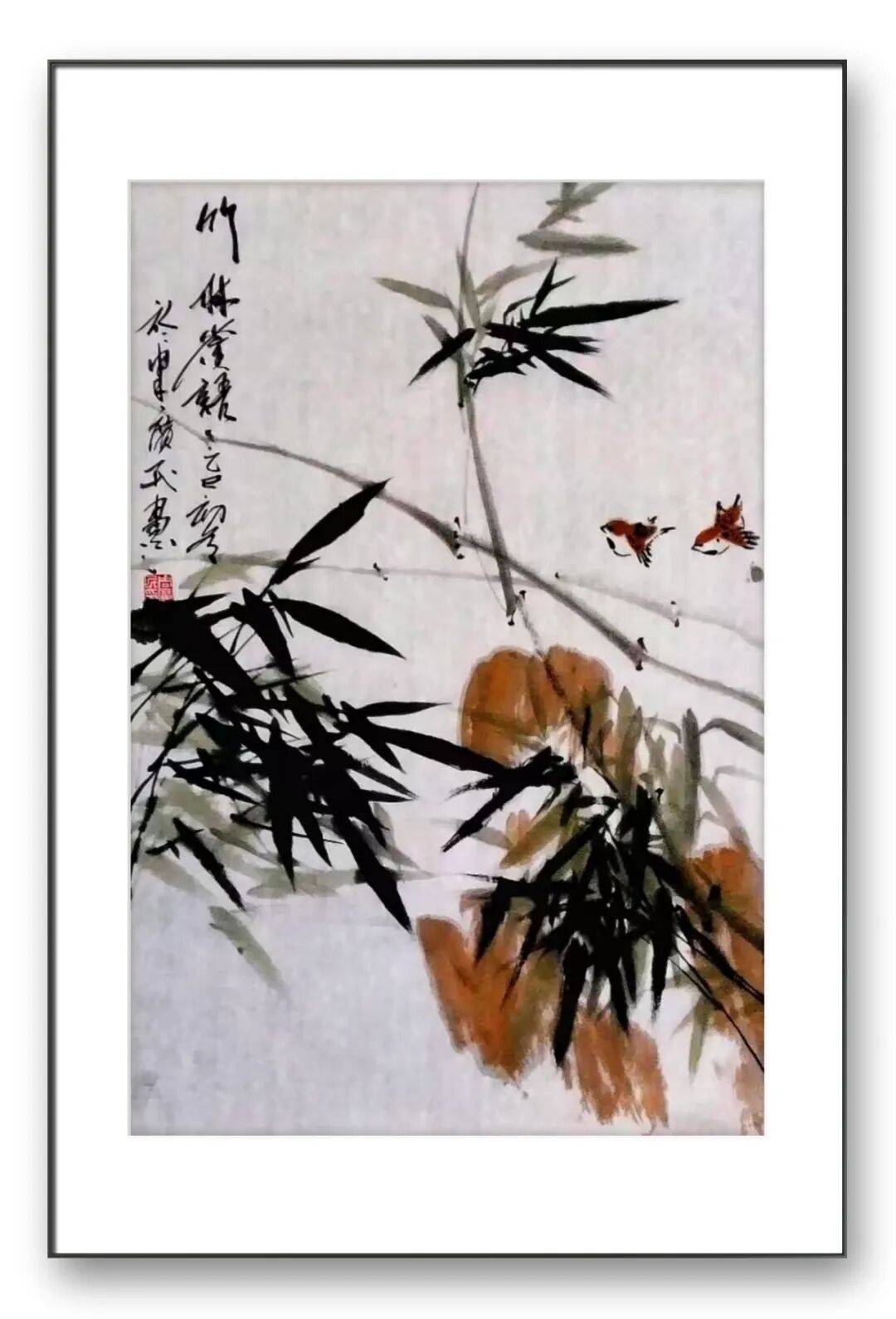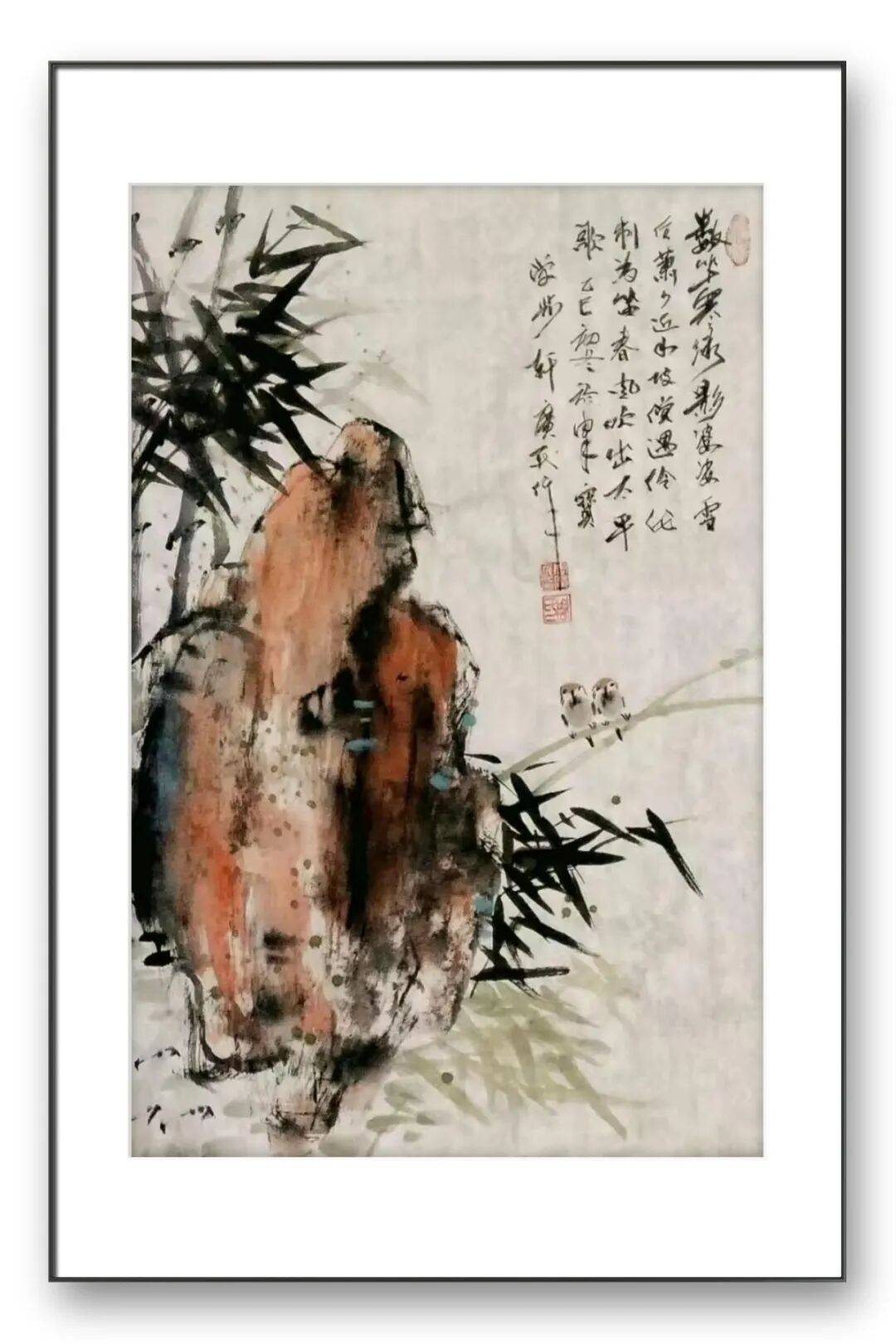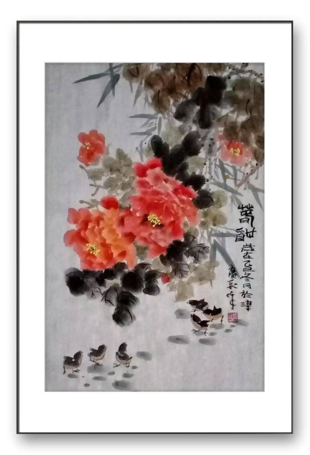 彩墨作品则展现出他大胆的色彩把控能力与亲和的审美追求。不同于纯水墨的清雅,他的彩墨花鸟设色斑斓鲜亮、对比强烈,却又相得益彰、不失雅韵。受刘燕先生工笔重彩风格的影响,他注重色彩与光影的结合,主体形象粗看色墨厚重、浓烈壮丽,细察则刻画精心、光影丰富。即便采用红绿对比的浓烈色彩,也能通过笔墨的调和避免俗媚,让画面既具备强烈的视觉冲击力,又透着温润亲和的格调。这种色彩运用,既贴合大众的审美喜好,又彰显出他对色墨关系的深刻理解,体现出“雅俗共赏”的艺术担当。