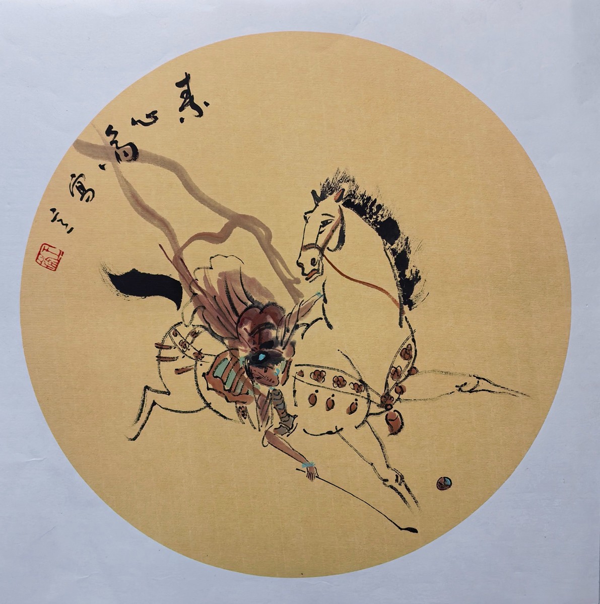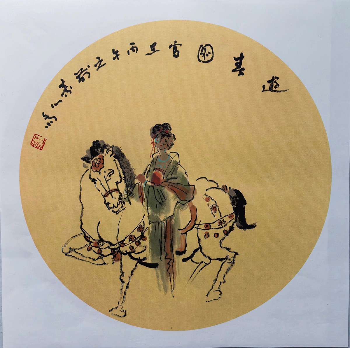 先生之笔,藏山河灵秀,载岁月匠心。其笔下骏马非俗世之驹,乃“天马行空”的神骏——四蹄腾空如踏流云,鬃毛飞扬似逐长风,中锋走笔藏千钧之力,勾勒出筋骨峥嵘;侧锋扫墨含万种柔情,晕染出神采飞扬。仕女则如从盛唐烟霞中款款走出,丰颊凝脂若春桃初绽,眉黛含情似秋水凝波,衣袂飘飘若飞天遗韵,裙裾轻扬似溪水流波,与骏马相映成趣,恰是“人马相依,天地同辉”的绝妙意象。