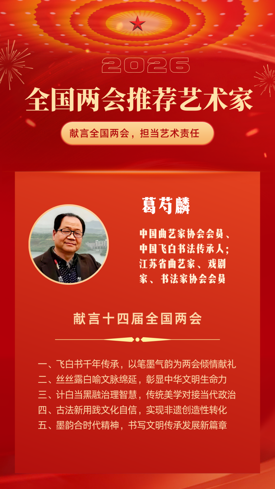 作为深耕基层的文化工作者与政协委员,葛芍麟始终关注文化传承、基层发展与民生事业。此次借飞白书献礼两会,他也道出了自己的心声与建言:一是希望加大非遗传统文化保护传承力度,让飞白书等古老技艺走进校园、走进民间,培育更多传承人,让中华文脉代代相传;二是推动文化与民生、经济深度融合,以文化赋能乡村振兴、城市发展,让文化成果惠及更多百姓;三是鼓励传统艺术创新转化,让千年艺术适应新时代语境,成为彰显文化自信、讲好中国故事的重要载体。