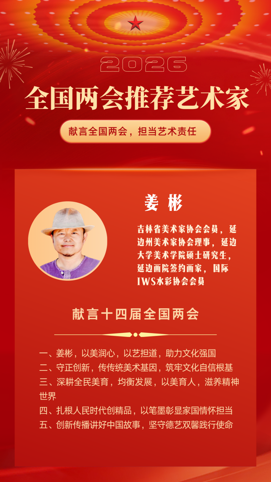 春风浩荡,文运兴昌。今年全国两会即将隆重召开,文化强国、文艺创新、全民美育再度成为时代强音。在全国两会百名推荐艺术家的行列中,来自吉林延边的水彩画家、吉林省美术家协会会员姜彬,以一份情系家国、着眼长远的献言,展现了一位艺术家的文化自觉与使命担当。他以笔墨为媒,以作品为语,将个人创作实践与国家文化战略紧密相连,用真诚与专业,为新时代美术事业高质量发展发出响亮声音。