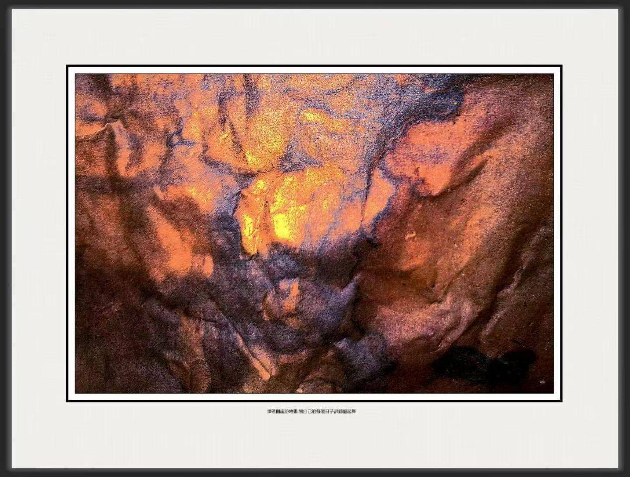 构图是绘画作品的整体框架,它决定了画面的平衡、节奏和视觉中心。在谭延桐的这幅超验绘画中,构图展现出一种独特的超验秩序。画面没有遵循传统的对称或均衡构图原则,而是以一种自由、灵动的方式进行布局。各种色彩、笔触和线条在画面中自由分布,却又在看似无序中达到一种微妙的平衡。这种平衡并非是外在形式上的对称,而是内在精神上的和谐统一。视觉中心并不明确地集中在某一点,通过色彩的对比、笔触的变化和线条的引导,让观者的目光在画面中不断游走,发现多个有趣的视觉焦点。每个焦点都像是一个超验世界的入口,吸引着观赏者深入探索。画面中浓烈的橙色区域可能会首先吸引目光,但随着观赏的深入,那些深沉的紫色部分、独特的笔触和神秘的线条又会不断带来新的视觉体验。从整体的空间布局来看,画面具有一种流动感和延展性。色彩和笔触的延伸打破了画面的边界,让观赏者产生一种超越画布空间的感觉,感受超验世界的无限广阔。这种构图方式打破了现实空间的限制,营造出一种超验的、梦幻般的氛围,使观者能够更加自由地在艺术家的精神世界中遨游。