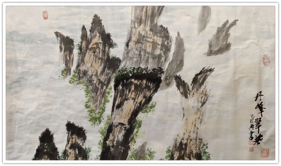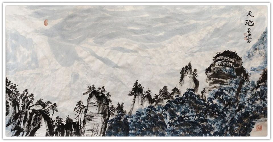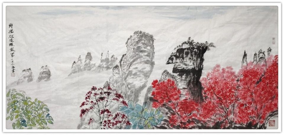 毫无疑问,胡兴书画山水就是南北两宗的融合新法度,笔笔见骨,却又不失品逸,积墨如刮铁粗犷,却也有赋淡彩显儒雅,刚打铁铸的山水精神,还有淡泊俊拔的姿美质观,水墨生五色,色彩洇氤氲,让张家界山水回归了自然态,也走进了写意峭崎显韵媚逸的审美新境界。耸其峰,叠其翠,色不碍墨,墨不碍色,水墨彩的交融,不是全湿,也不是全枯,而是中和悦的泽润,以润丰神,便是山水最为悦目动心的唯妙审美。