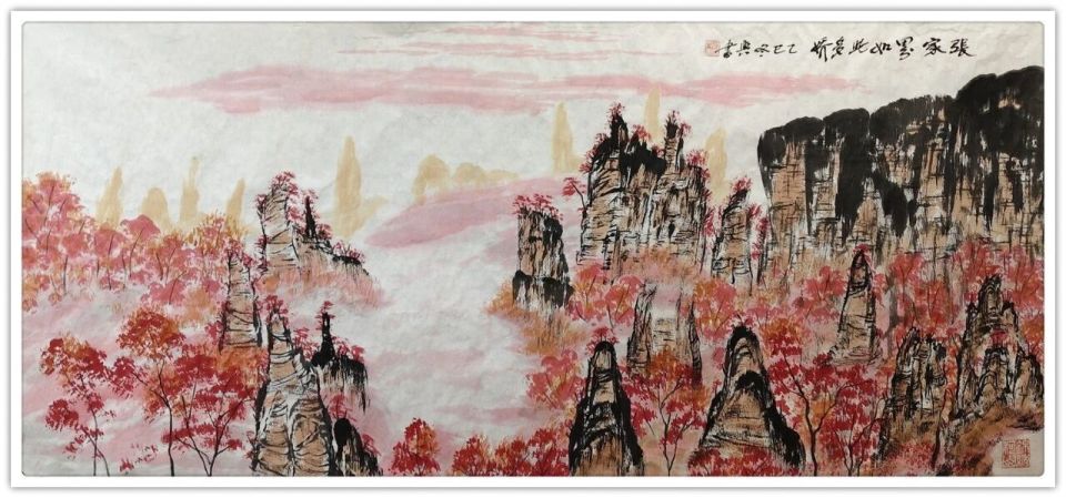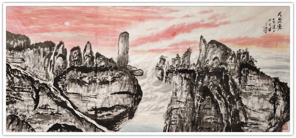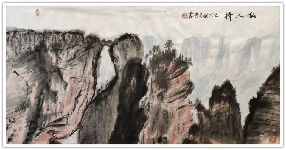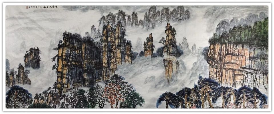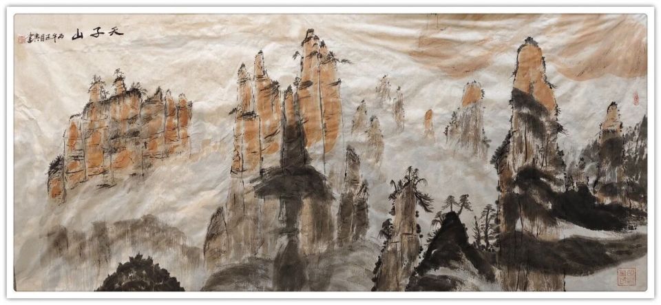 他对张家界的山水体貌有丰富的情感,流历真山真水,外师造化中得心源,把张家界的自然实像写意成水墨里的丰满意象,气韵生动神风浩荡,这便是制韵地域山水的奇墨神笔。