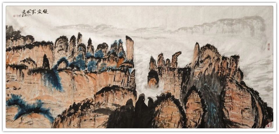 为了表现张家界山体层层叠立的特征,他创立了独有法度的皴笔,把折带皴法的错落感与斧劈皴的峭崎感融合在一起,刚柔相济,刷送出动感,铺陈出势感,整体而观有鲜明的宋元法度,但是再细细究竟,却又是自立面目的新法,既不是单独折带皴的错落感,也不是单独斧劈皴的直峭感,统而有之,切意张家界山崖独有的体貌特征,可谓是把视觉经验化意成丹青臻品的典范。既可以为山水立骨,也可以为山水传神!