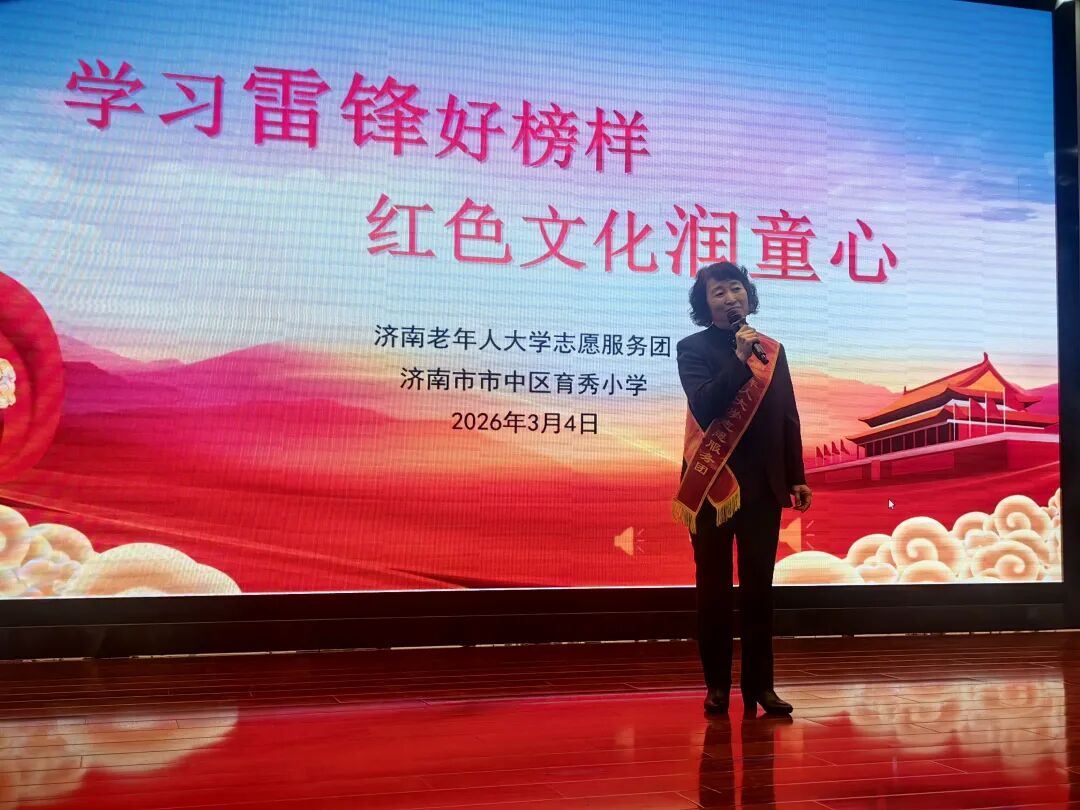 “学习雷锋好榜样,忠于革命忠于党……”熟悉的旋律,跨越岁月的回响,在今天下午的济南市育秀小学礼堂内,激荡出别样的温暖与力量。2026年3月4日,新学期伊始,由济南老年人大学志愿服务团带来的“开学第一课”联谊活动在这里温情上演。白发与红领巾交织,历史与未来对话,一堂生动感人的思政课,以春风化雨的方式,将雷锋精神的种子播撒进孩子们的心田。育秀小学党总支书记刘琦、校长李雅参加活动。