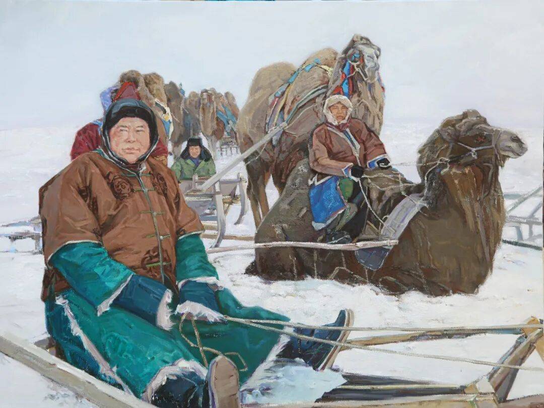 她的作品《特穆呼珠的奶茶》便是将日常生活的形象转化为充满仪式感和温情的精神图景。画面构图含蓄而集中,形成一种静观式的视觉仪式。色彩处理上,她延续了温和的调性,但增加了生活质感的表达,尤其是对器物与衣饰质感的描绘,这些细节不追求炫技,而是服务于情感的真实性与在场感,透露出深厚的生活实感与人文关怀。这幅作品尤其值得注意的是她对人物姿态与表情的克制处理,人物或低眉或侧影,不与观者直接对视,却通过肢体语言与环境的关系,传达出静谧而坚韧的内在状态。这种“去表情化”的表达,反而赋予形象一种普遍而持久的情感张力,传递出草原生活中宁静而坚韧的内在力量。