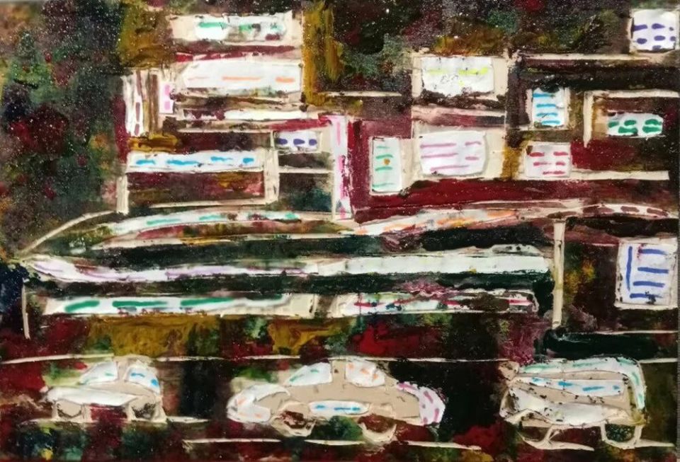 作品木板刻结合剪贴纸、再配色《夜晚城市大厦、店面、马路小汽车》