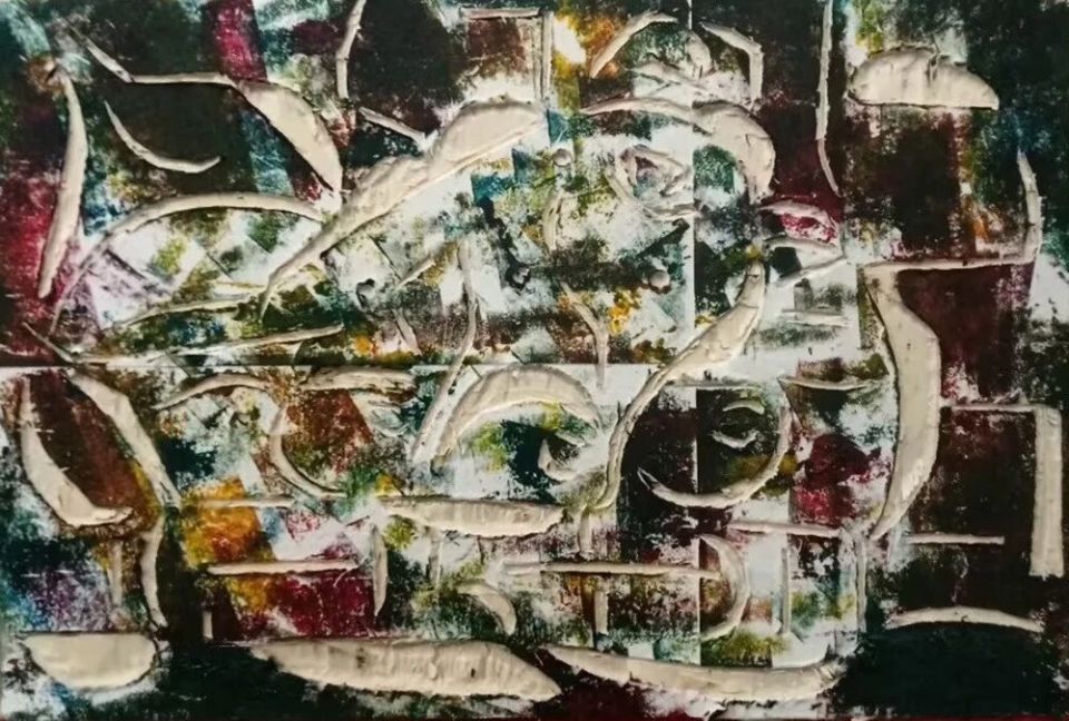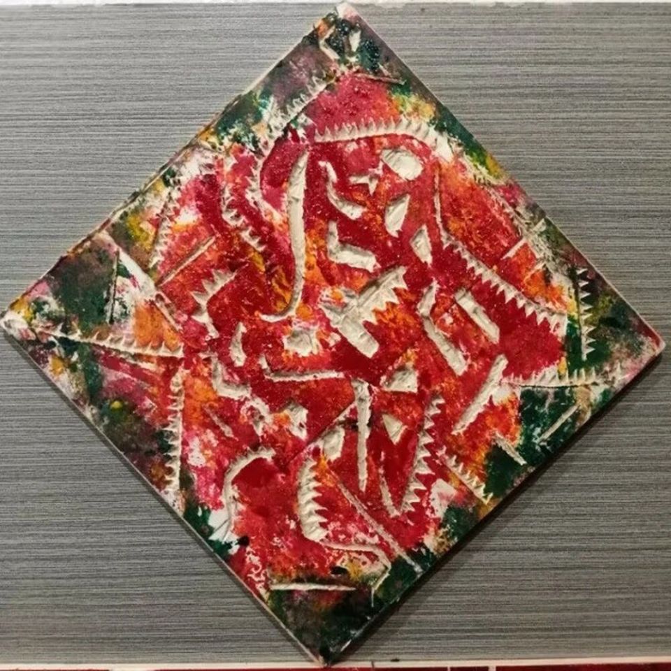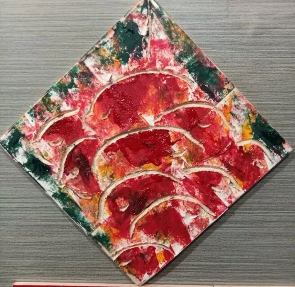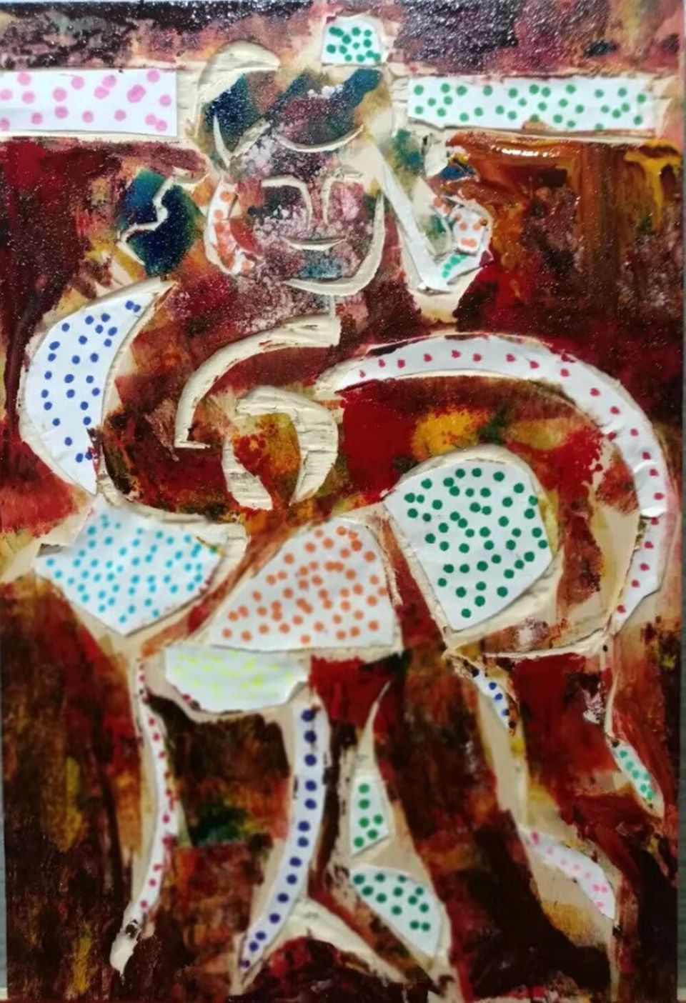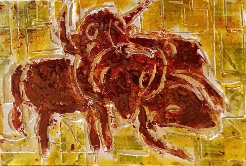作品木板刻结合剪贴纸、再配色《红色文化、时代三头金牛》