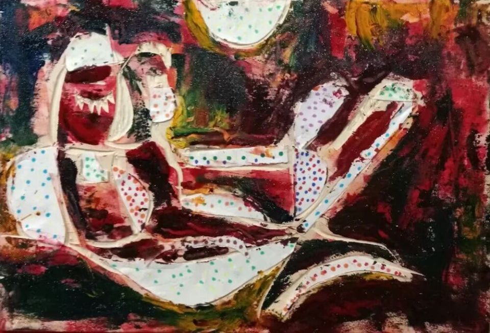 作品木板刻结合剪贴纸、再配色《藏族奶奶喂鹅》