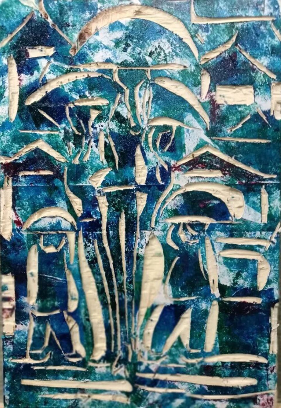 作品木板刻结合剪贴纸、再配色《夜幽间古镇、桥上游客、桥下游客船》