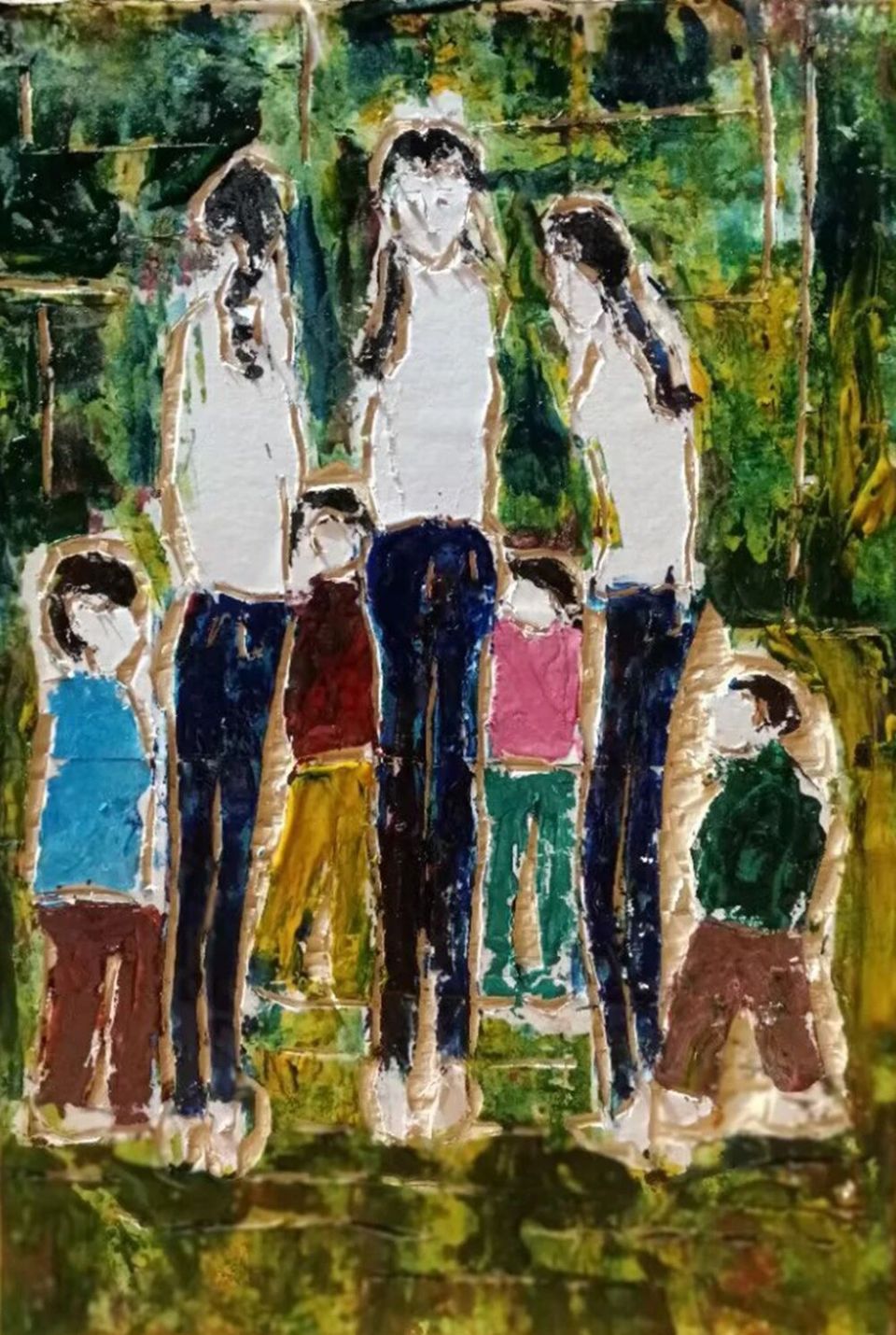 作品木板加纸刻结合配色《三位女青年小老师带着四个孩子、教育四个孩子团结友爱》