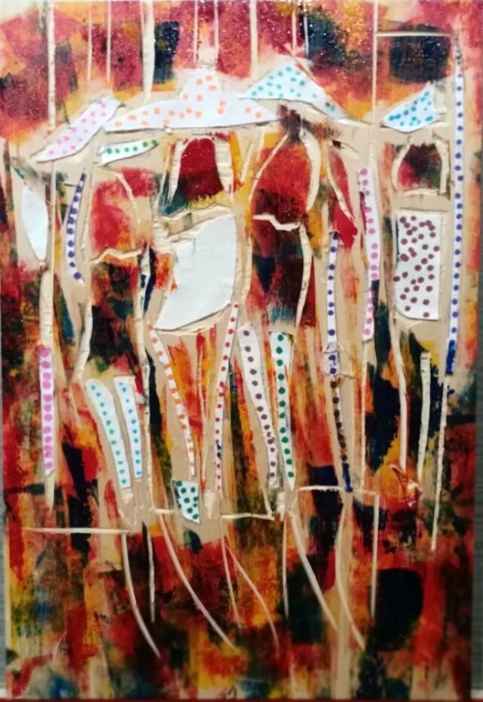 作品木板刻结合剪贴纸、再配色《雨天下晚间时尚、商场外一群青年女阿姨撑伞逛望、游乐》