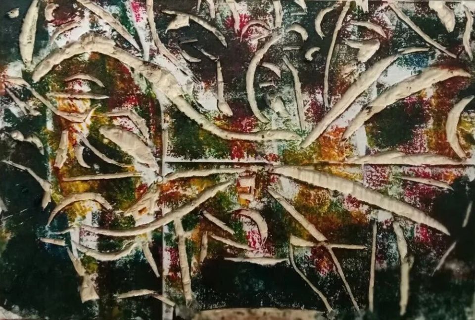 作品木板加纸刻结合配色《夜间、植物树与鸡相伴》