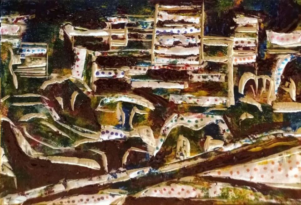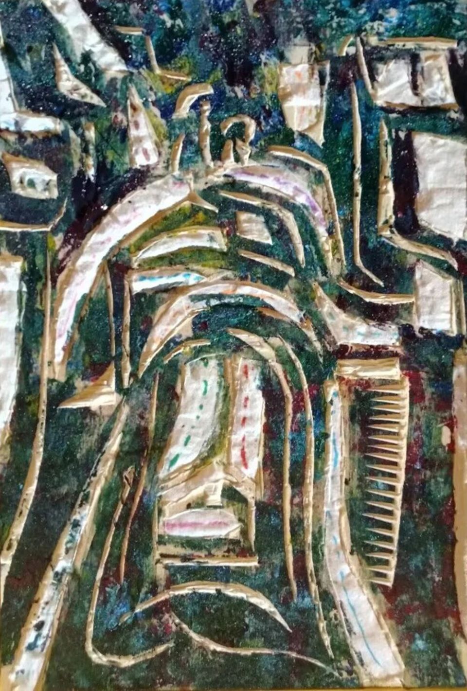 作品木板刻结合剪贴纸、再配色《夜晚间、城市企业大厦、汇聚公路桥、绿化河道》
