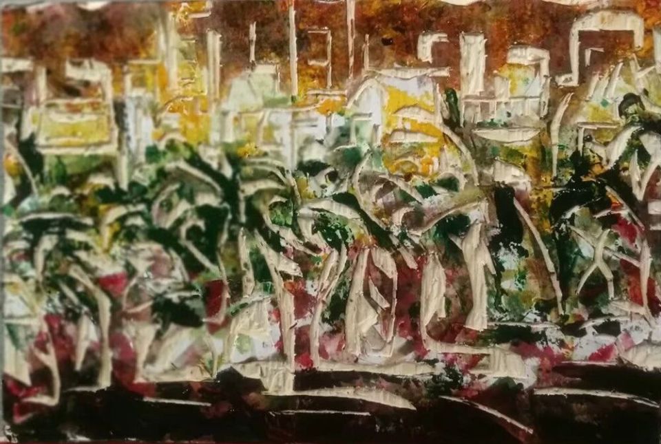 作品木板刻结合剪贴纸、再配色《夜晚绿灯、住宅灯下的植物、农村、城市建筑房》