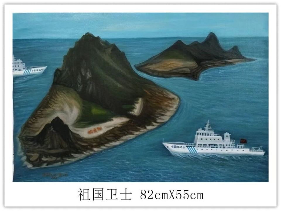 尤为可贵的是钱坤作品中强烈的时代感与家国情怀。《祖国卫士》超越了单纯的自然描绘,将视角投向守护海疆的执法船只。画面庄重肃穆,岛屿星罗棋布,标识清晰醒目,旗帜迎风飘扬,以具象的国家象征物,表达了对国家主权与守护者的崇高敬意,体现了艺术家自觉的时代担当。