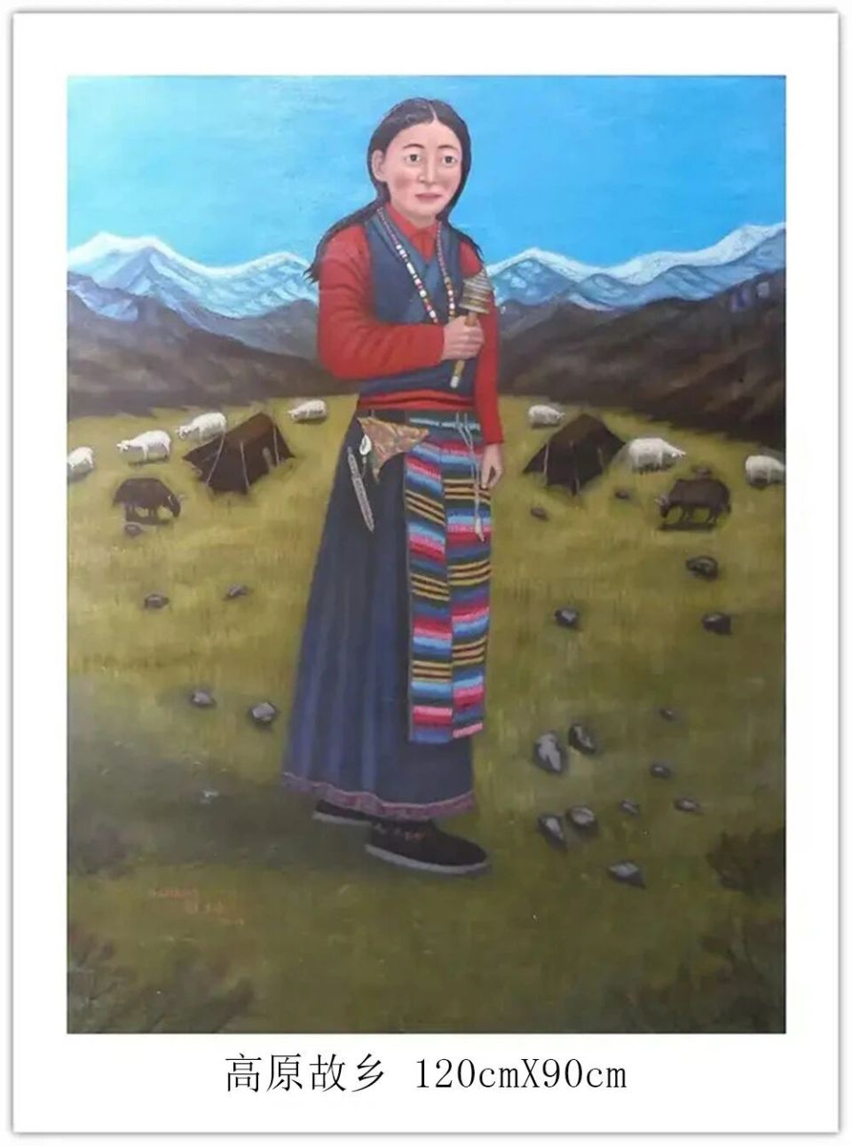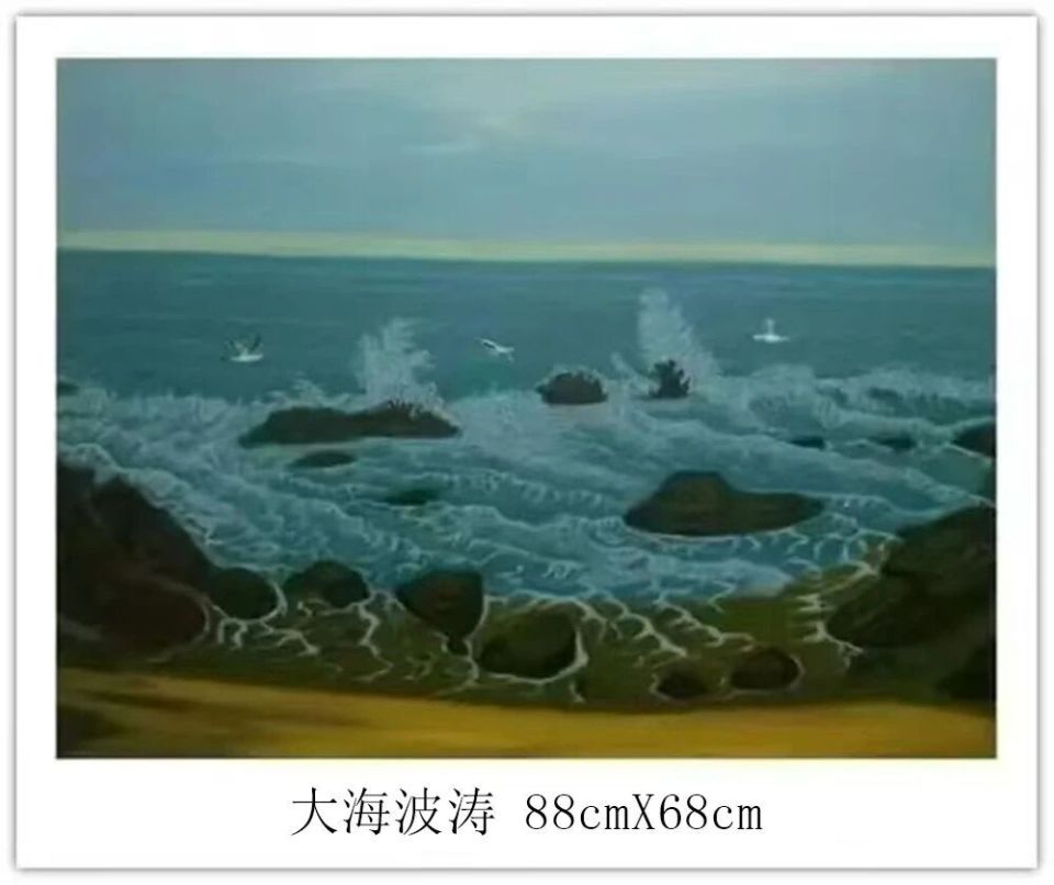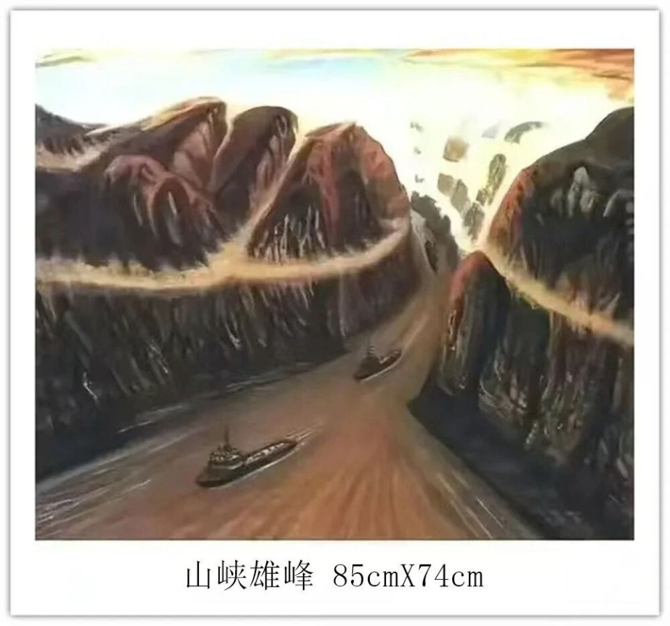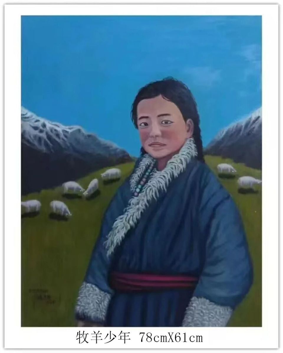 钱坤的艺术世界,首先是对民族风情的深情礼赞。如《高原故乡》与《牧羊少年》,以鲜明的色彩和细腻的笔触,生动描绘了藏族同胞的生活图景。身着传统服饰的人物与辽阔的高原、雪山、草原、羊群融为一体,画面和谐宁静,传递出浓郁的民族气息和对这片土地深沉的爱恋。这不仅是生活的记录,更是对坚韧、淳朴生命状态的颂歌。其次他的画笔饱含对祖国壮丽山河的咏叹《大海波涛》以磅礴气势展现海洋的雄浑力量,翻滚的巨浪与翔的海鸟充满动感与生机;《山峡雄峰》则以硬朗的线条和丰富的色彩,刻画出山峦的巍峨险峻与河流的奔腾不息。这些作品彰显了他驾驭宏大场景的能力,以及对自然伟力进行艺术升华的深厚功力。