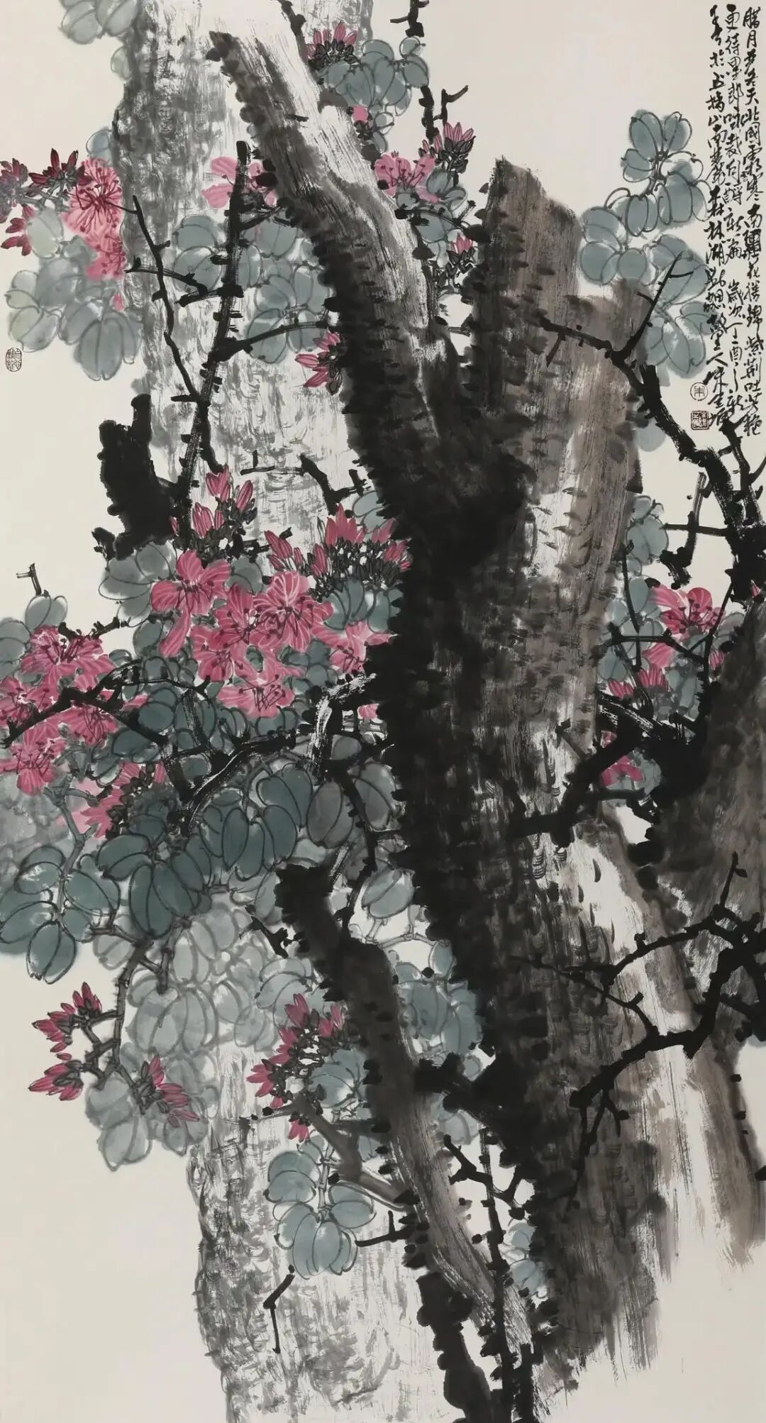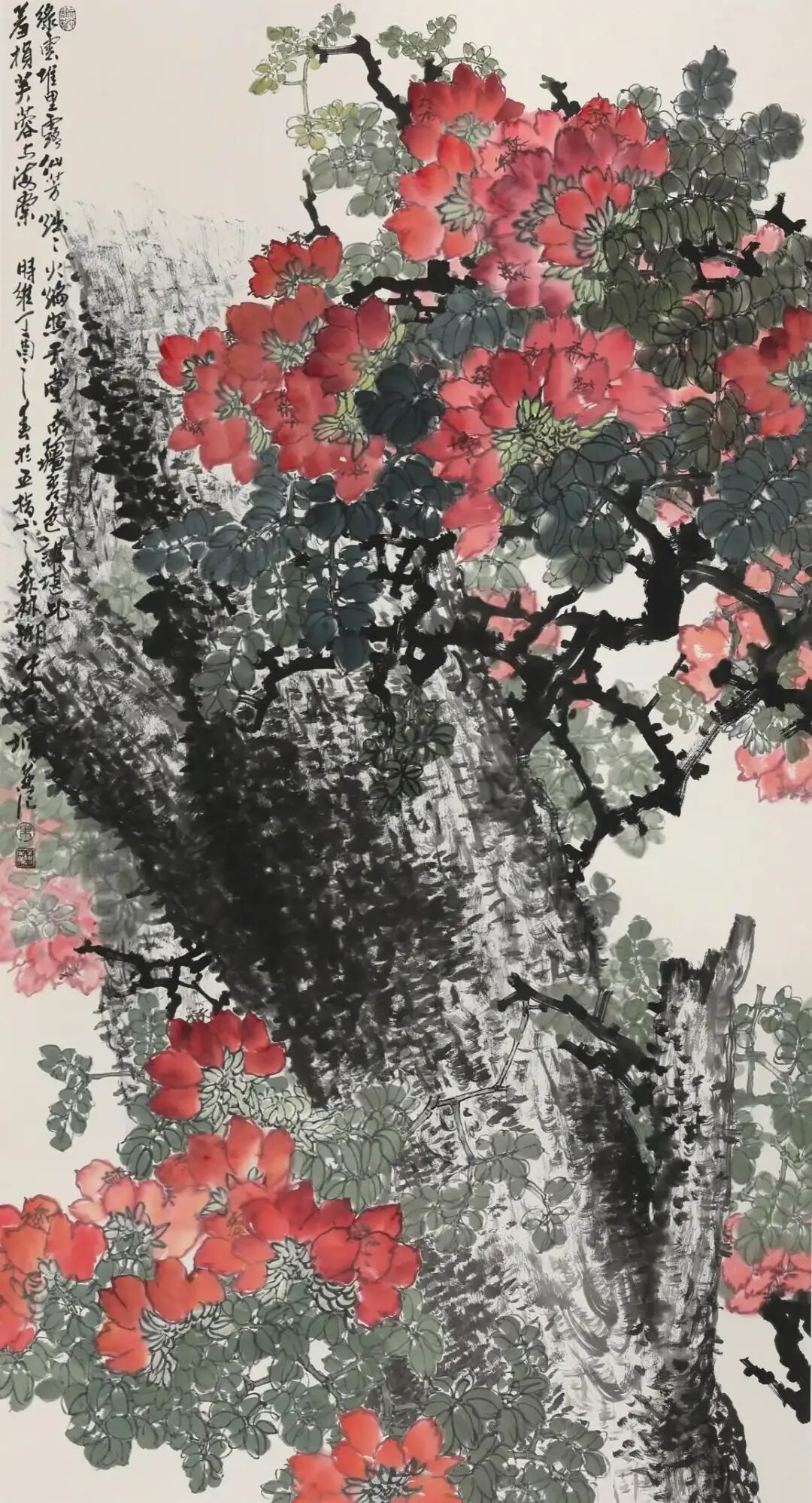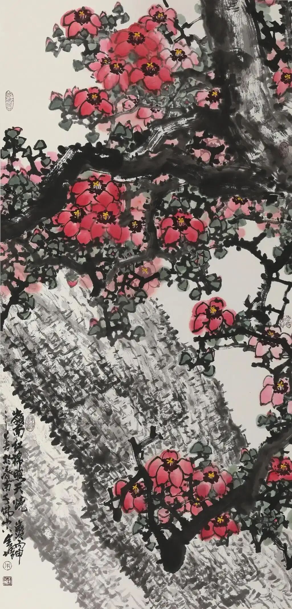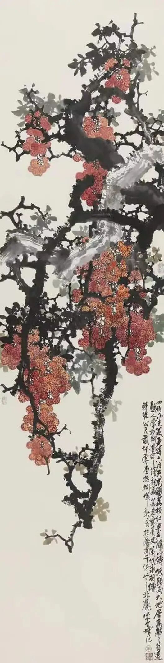 二是,我在与朱全增的闲聊以及进一步探询中才得知,他一生并非顺达,而是从基层工作一步步转向绘画专业,进入和提升到美术创作和领导岗位的。其中的人生滋味谁也无法确切得知,只有他本人才能真正深切体知。尽管如此,我却仍从他的言谈描述中,感知其辛艰以及分享他的艰辛所带来的收获和喜悦。山东的先贤哲人孟子曾在评赏诗时说:“知人论世”。这也是作好文艺和绘画评论的第一原则。如果你不了解画家的个人经历,那么如何真正评解其画的思想内涵,趣味和风格取向呢?可以说,朱全增先生的花鸟画不仅格局宏大,而且所选题材,虽有的墨竹,蘭草以及山石累累,但最令人注目的却是他笔下那些粗壮,遒劲,横空出枝或矗矗耸立的树幹,不论是红梅或木棉,都在树枝的支撑下才得以熠熠生辉,才充满了不屈不挠的生机,这不正是他个人经历的绝好写照吗?