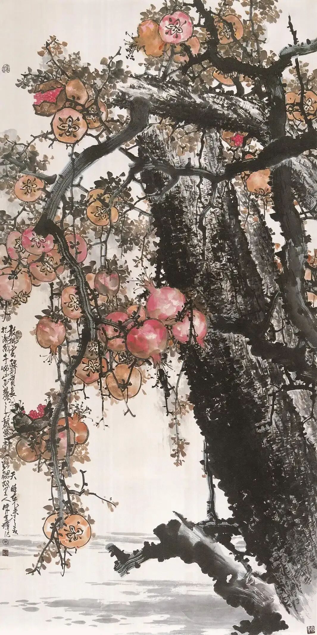 从笔墨角度来看,朱全增的花鸟画笔力沉厚,墨意烂熳,虽为造型抒写,但终究还是为其画面整个“气象”所服务。五代荆浩曾说:“而有真景,可忘笔墨”。而我们不妨说,朱全增的花鸟画乃是“而有气象,超越笔墨”。他的笔墨是沉浸在整个气象之中的,在写实和写意之间,笔墨找到了一个平衡点,在以写实为主、写意为辅所形成的花鸟“气象”中,笔墨既能不质不形,如飞如动,又复隐迹消泯,卓然积微。