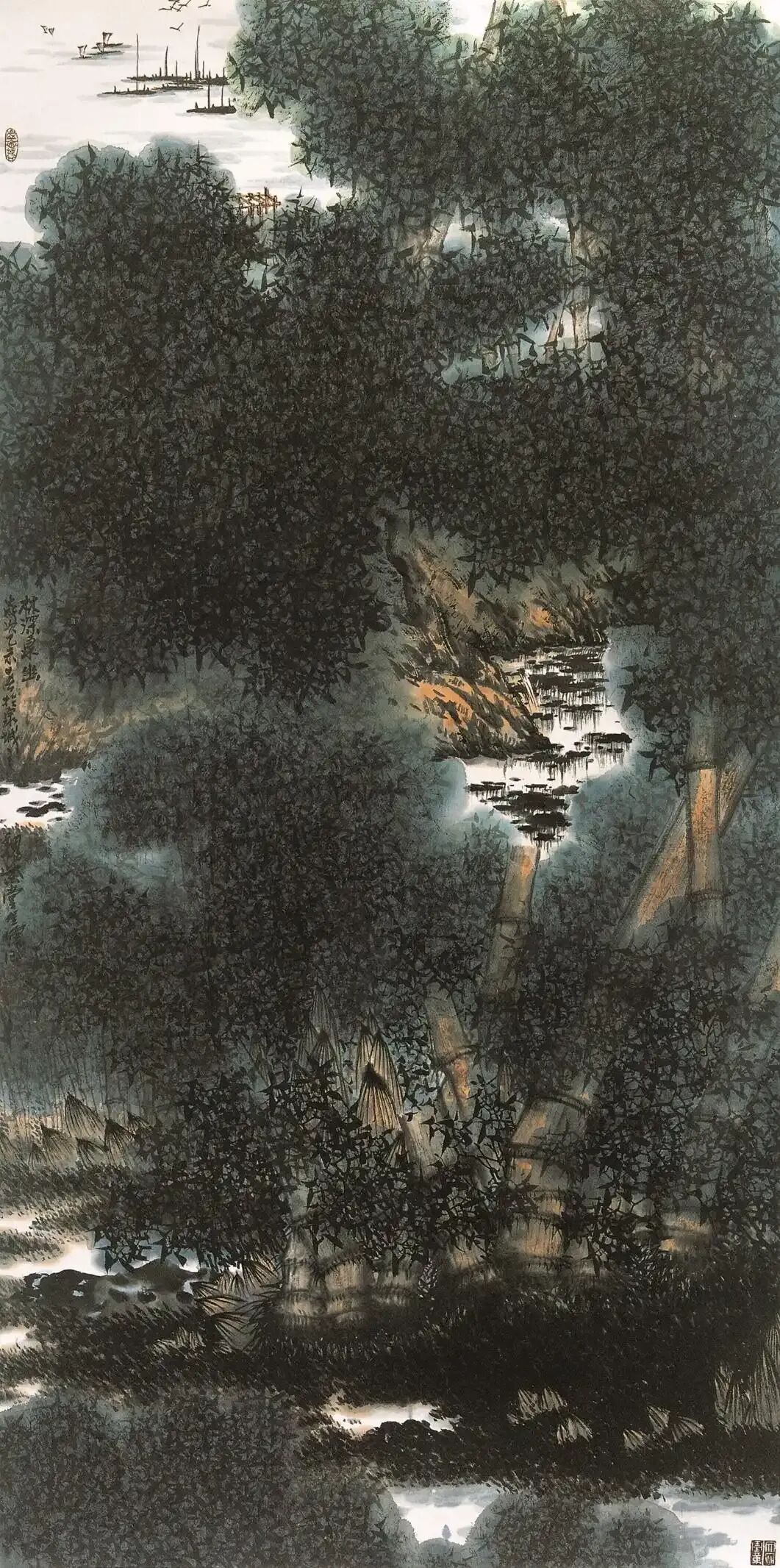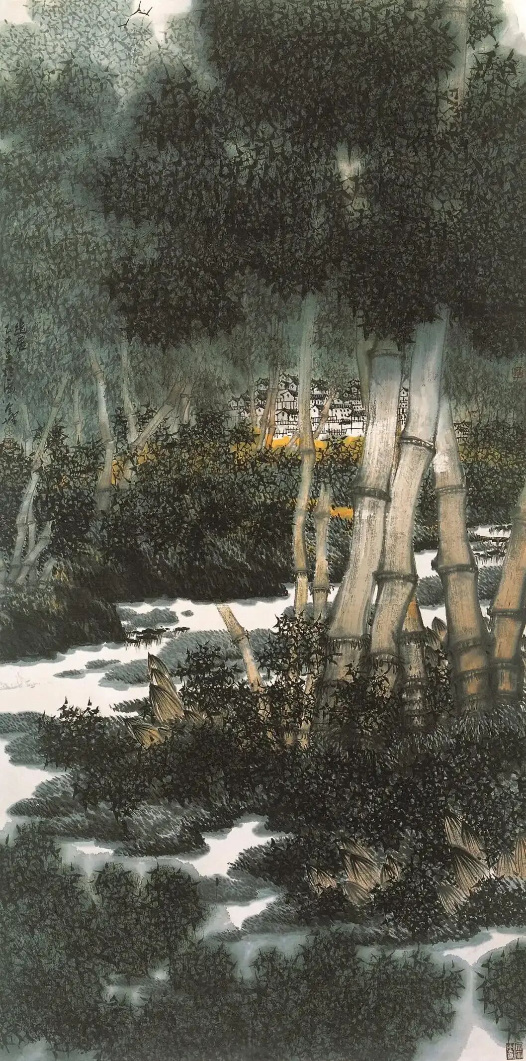 朱全德先生不仅长于花鸟,其实他的山水同样表现出很高的水准。在我看来,他是将山水与花鸟两者很好统一起来了。或者说,他的花鸟是以山水作为宏阔的自然背景,而将花鸟形象立为画面的主体。在这方面,前辈大师像潘天寿就是这样的代表画家。潘天寿的花鸟从来不是孤立的形态,山涧,巨石,峰峦,溪流,皆为他一一摄入作品,与花鸟形象和整个布局构成了一个有机整体。而朱全增的花鸟画亦可如是观,失缺了山水自然背景,花鸟固然可以独立成象,但境界,格局和气势,则大相异趣了。