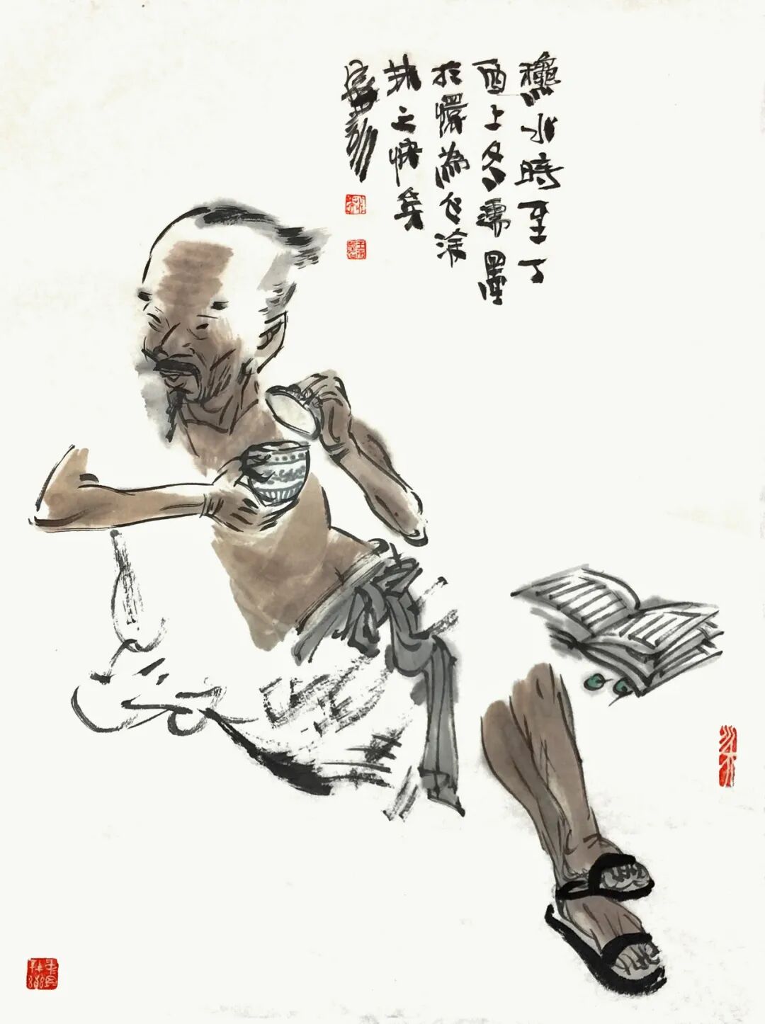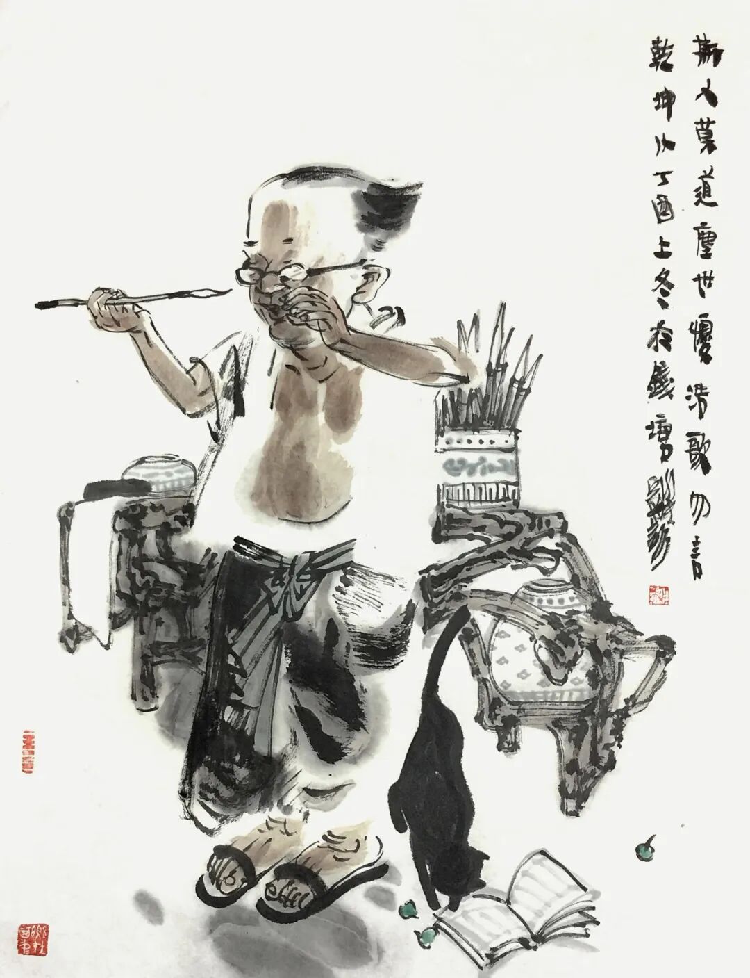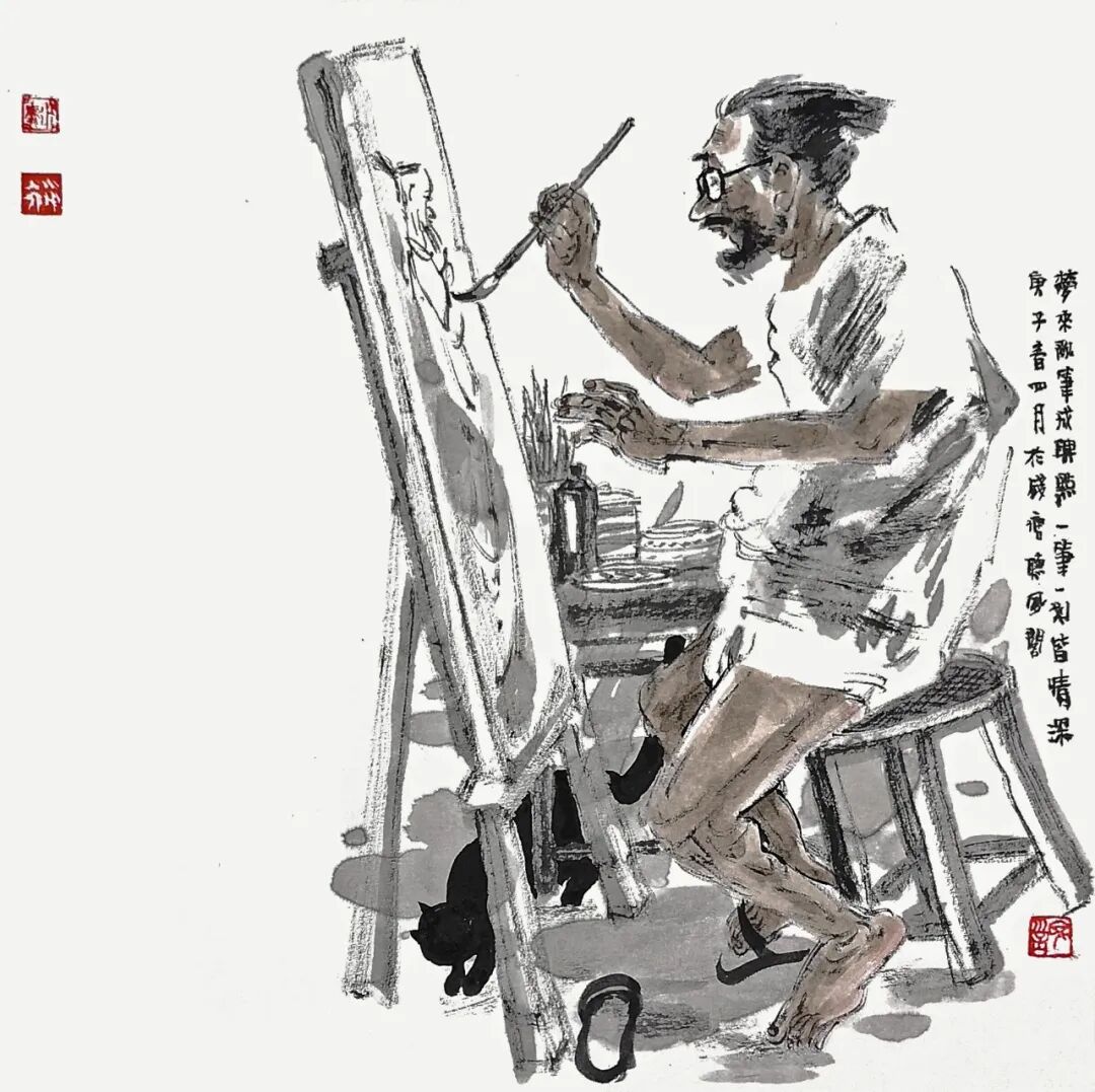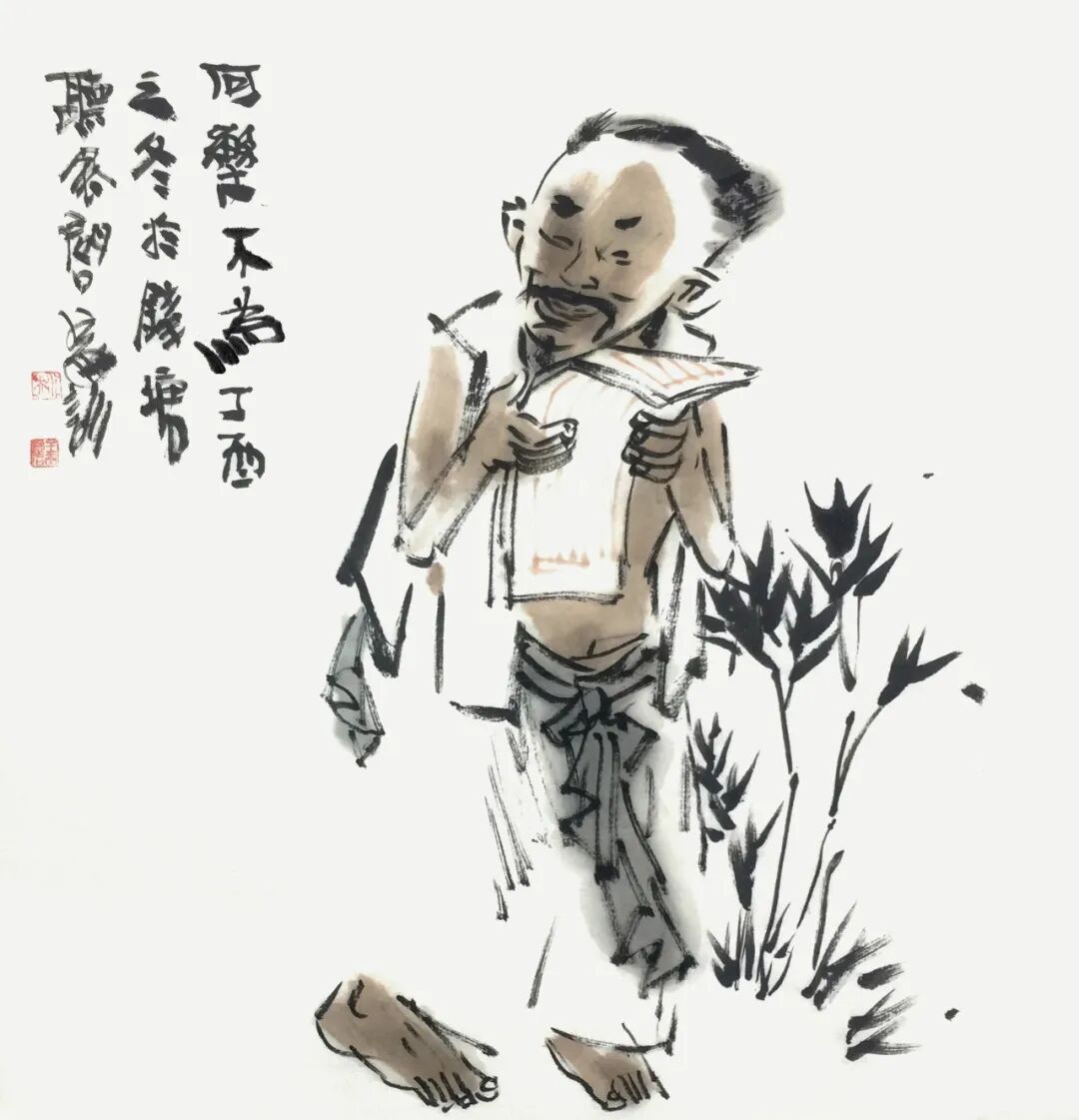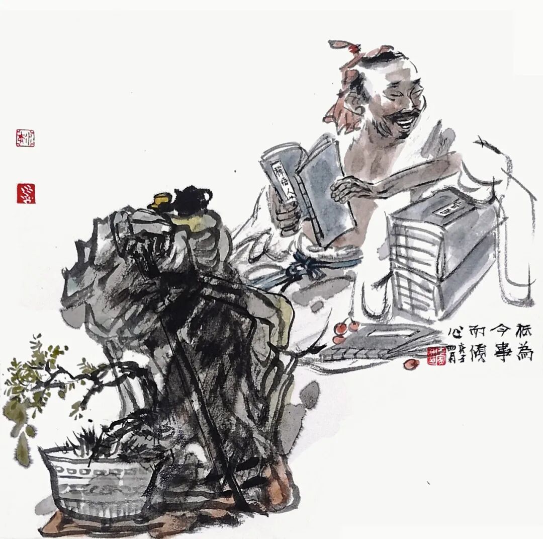他用画笔赞美生命的质朴与平实;赞美自然的野趣与生机;赞美人的真诚、勤劳、淡泊与超逸。他的人物画,明朗健康、清新雅朴,于浓密中寓淡宕,于烂漫中见素朴,洋溢着一派动人气息,在现代繁忙的生活中,他写意人物画为观众提供了一个心灵的栖息之地。
