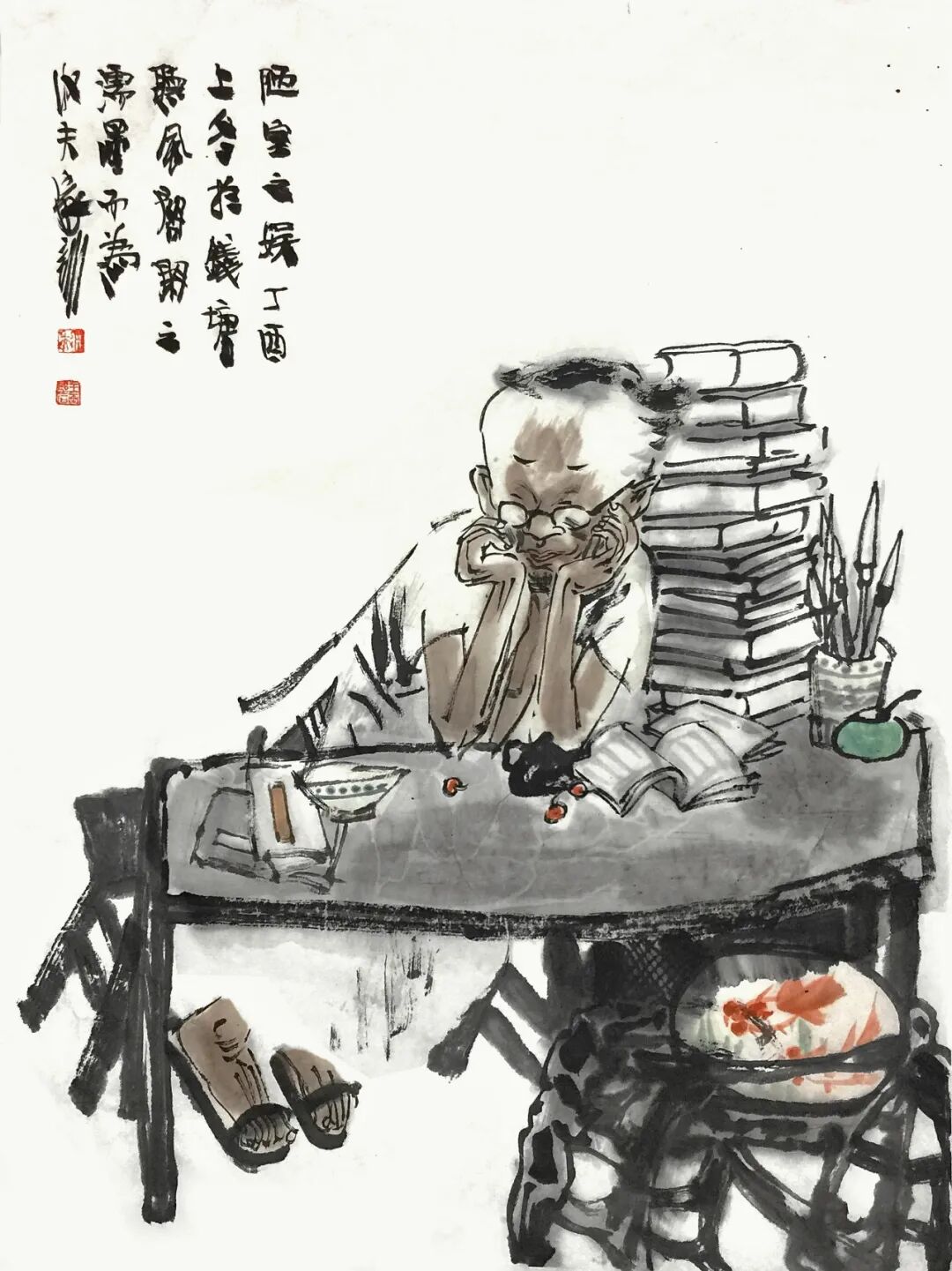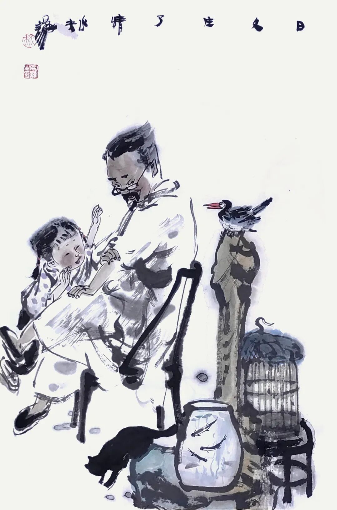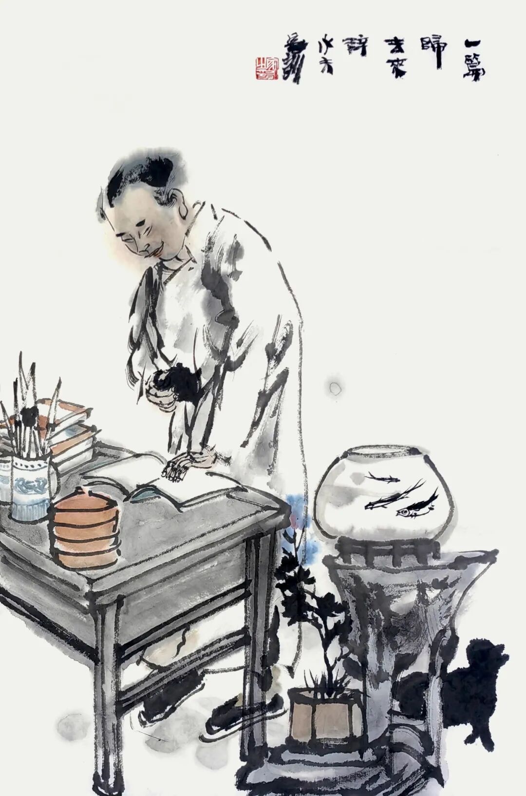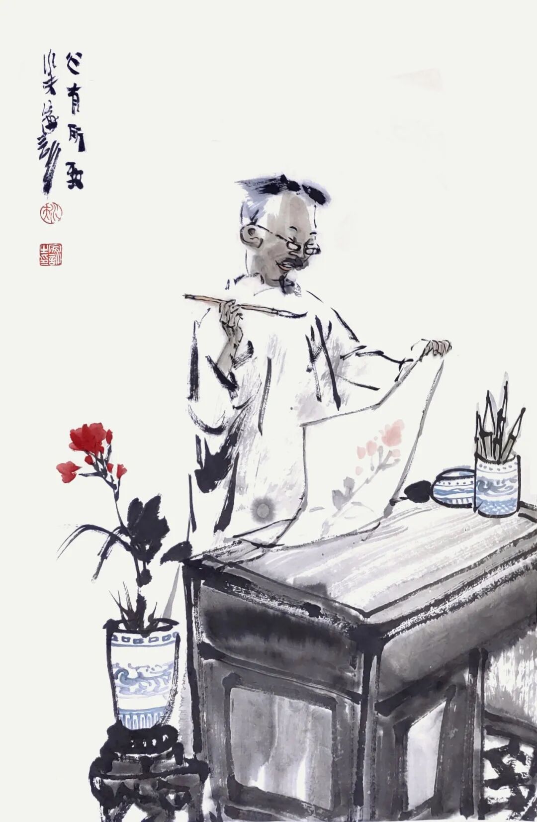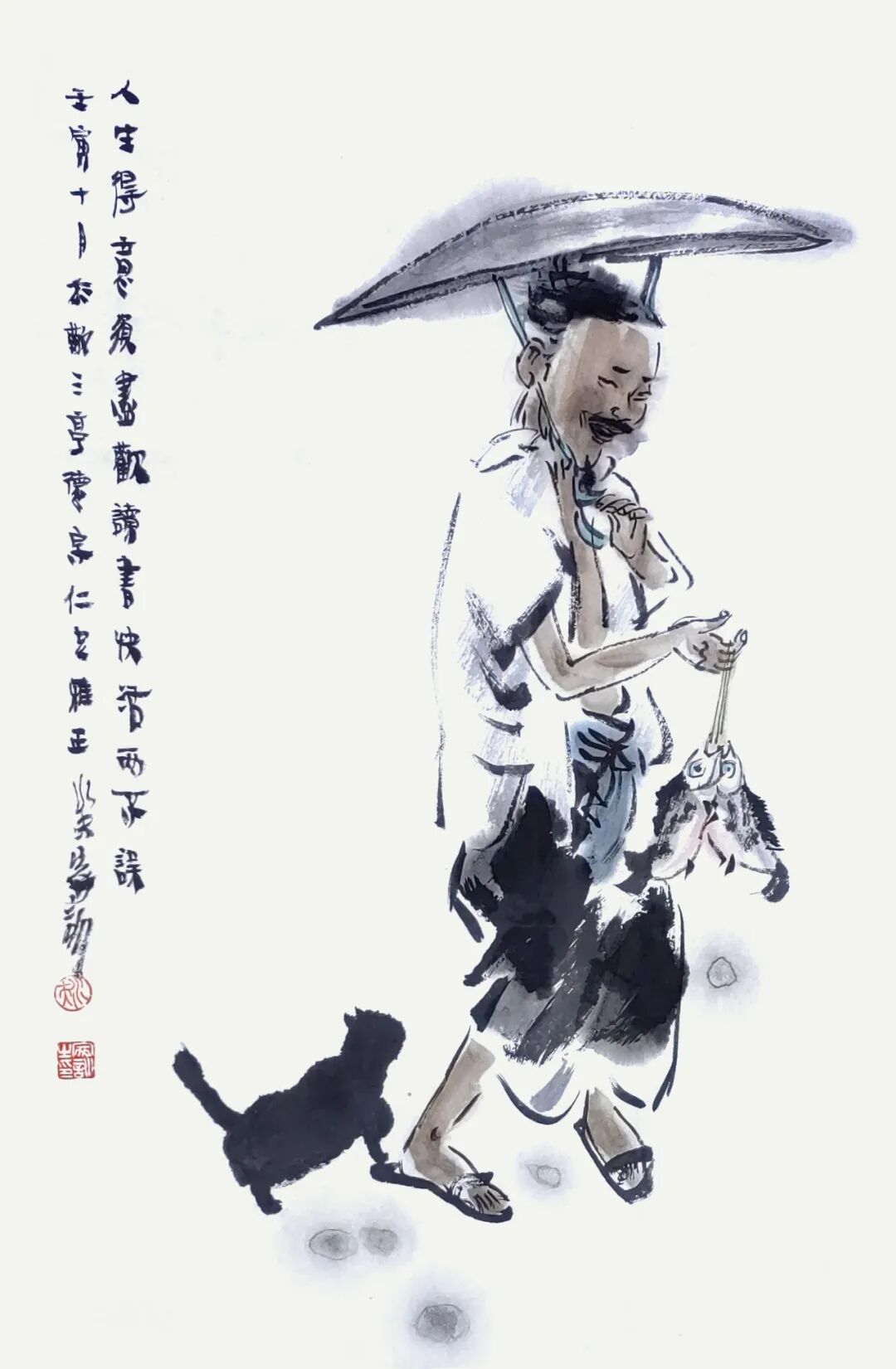 他用画笔赞美生命的质朴与平实;赞美自然的野趣与生机;赞美人的真诚、勤劳、淡泊与超逸。他的人物画,明朗健康、清新雅朴,于浓密中寓淡宕,于烂漫中见素朴,洋溢着一派动人气息,在现代繁忙的生活中,他写意人物画为观众提供了一个心灵的栖息之地。