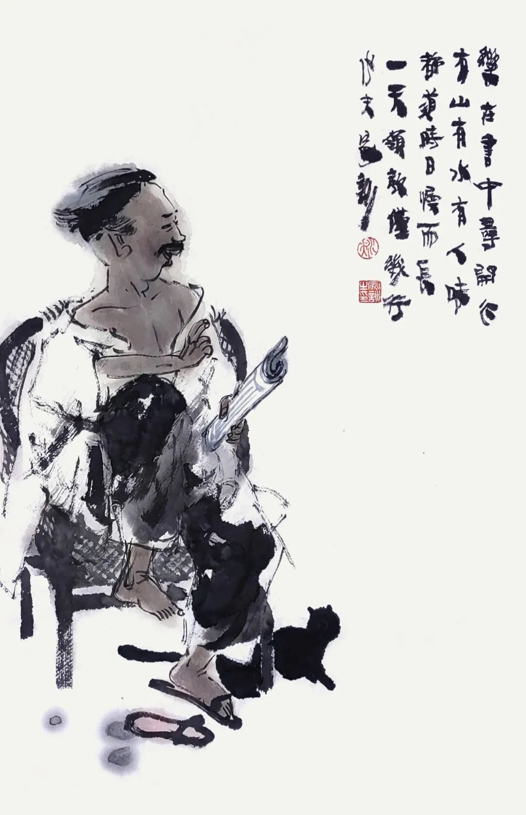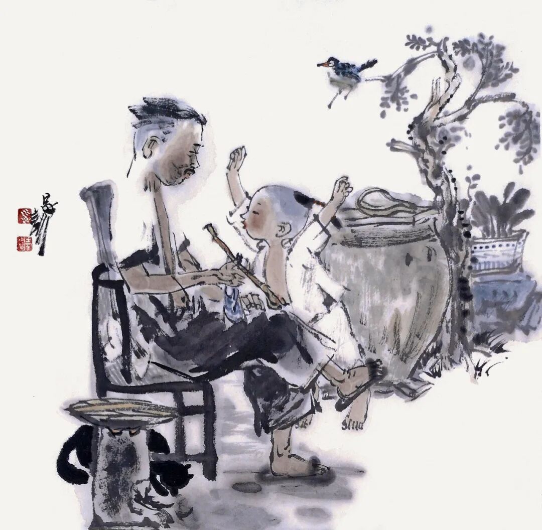王家训的写意人物画耐人品味,同样在于他展示一种心境;在他的画里,景物总是那样平静、人物总是那样恬淡温和。我们不难在其朴素、朴拙的作品背后,感受到画家对宁静、淡泊、单纯、质朴、平和之境的向往。
