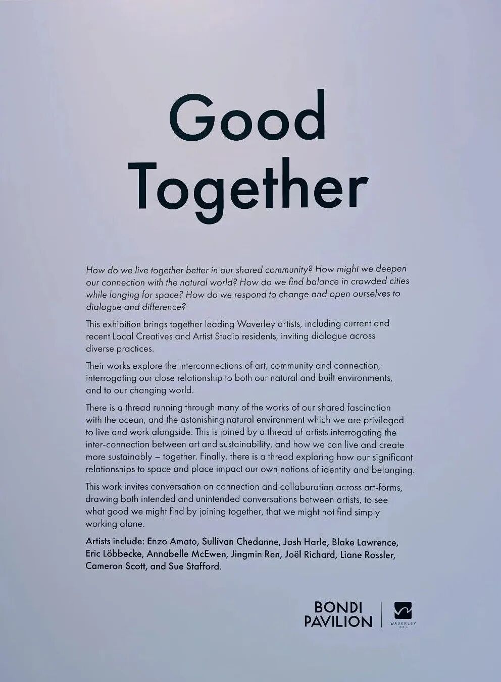 2026年2月22日,由 Waverley Council 主办的 “Good Together” 当代艺术展在悉尼 Bondi Pavilion 开幕,展览将持续至4月19日。展览汇聚多位活跃于Waverley地区的艺术家,通过跨媒介创作回应社区、自然与可持续未来之间的时代议题。