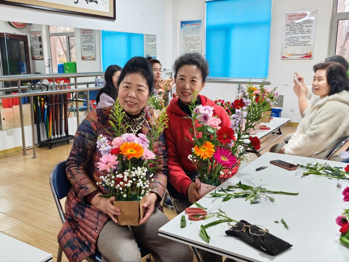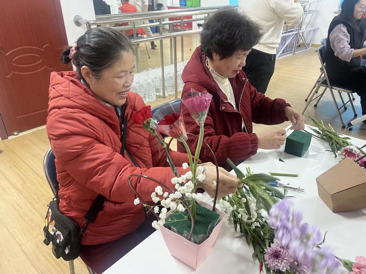 插花体验环节志愿者结合妇女节的美好寓意,详细讲解了花材的养护方法,还分享了每种花材的美好寓意。居民们听得津津有味,随后纷纷动手创作,挑选心仪的花材,修剪枝叶、搭配造型,充分发挥想象力和创造力。一束束错落有致、独具匠心的花艺作品悄然成型。捧着亲手制作的花束,居民们纷纷拍照留念,定格节日里的美好瞬间。