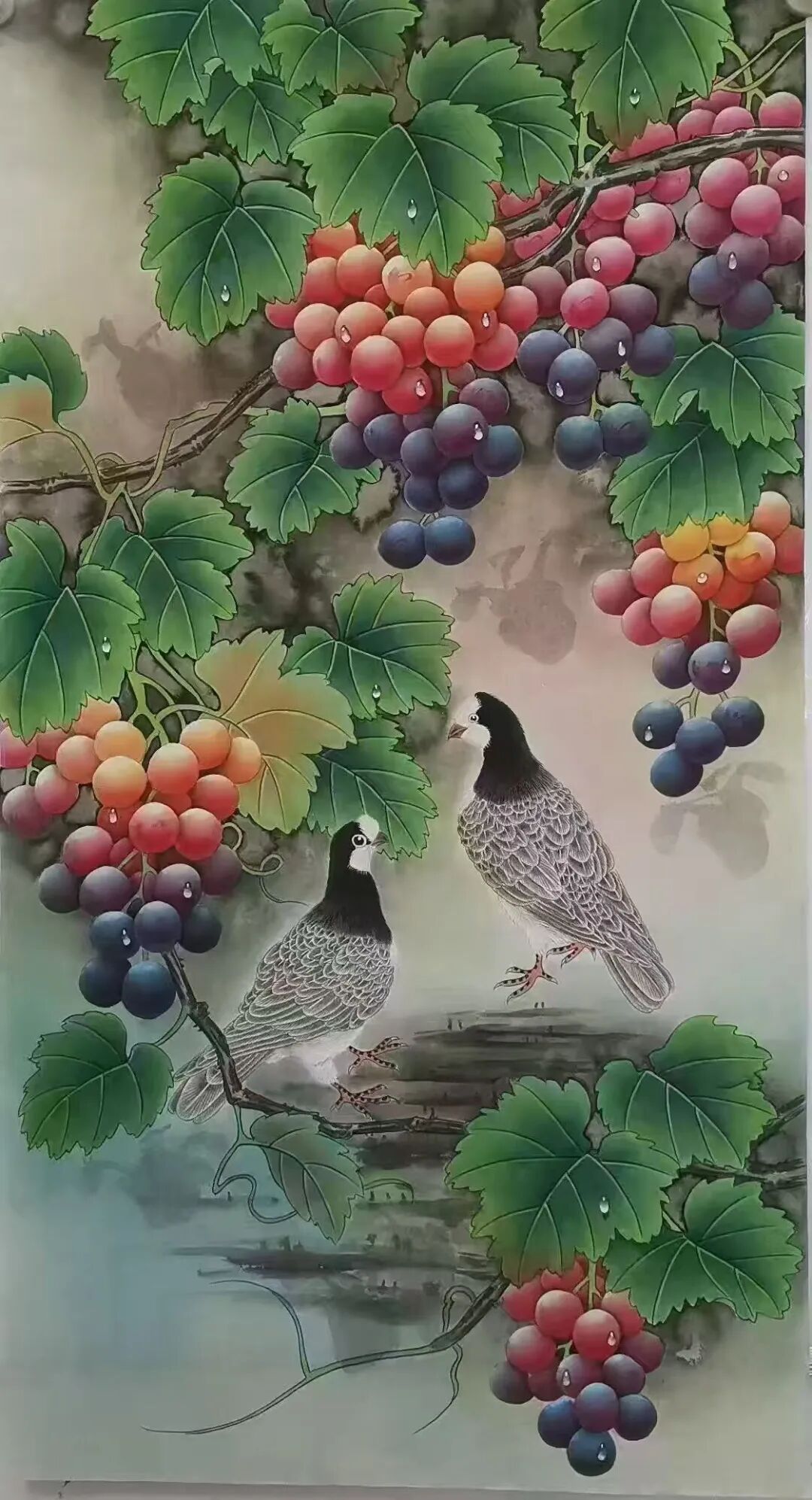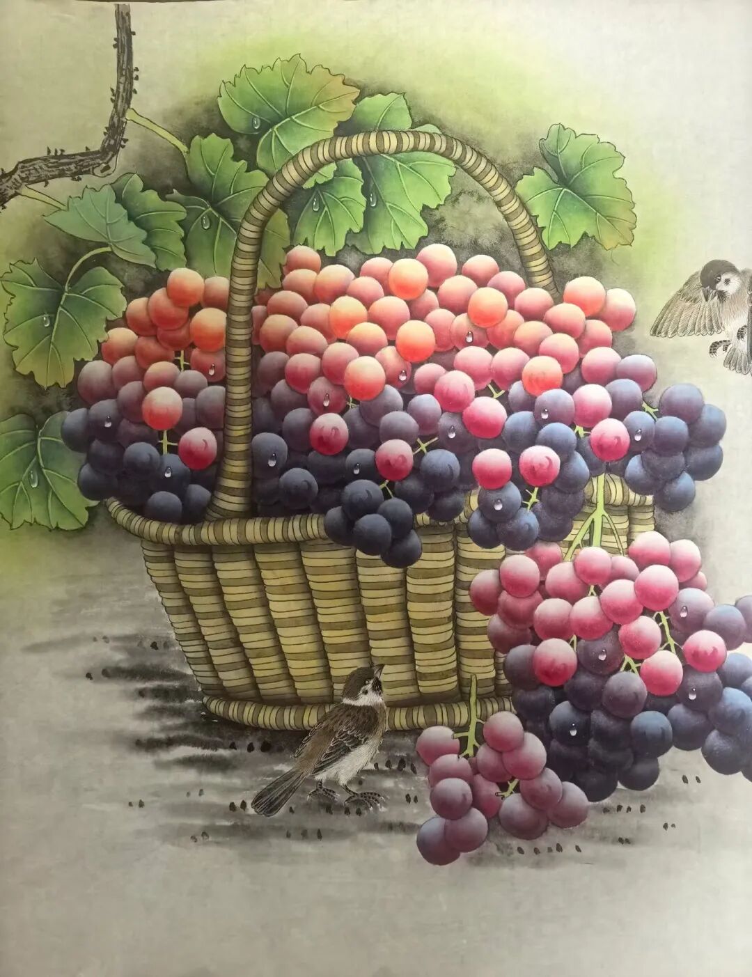 工笔画是贺天飞艺术的重要语言,尤其在《葡萄松鼠》《荔枝小鸟》《青绿葫芦》等作品中,其细腻的笔触与严谨的造型令人惊叹。如《葡萄松鼠》中,多串葡萄以淡粉、深紫、蓝紫分层渲染,每颗葡萄表面的水珠用留白法点缀,既保留了工笔“穷工极妍”的特质,又通过“水珠”的透明感赋予葡萄“刚被雨水滋润”的鲜活;松鼠的黄褐毛发以细笔攒点,背部黑白条纹的渐变处理,连爪子的肉垫都清晰可辨——这种“形似”的追求,最终服务于“神似”的表达:松鼠仰头的灵动、葡萄垂挂的饱满,共同传递出“自然生机”的核心意象。