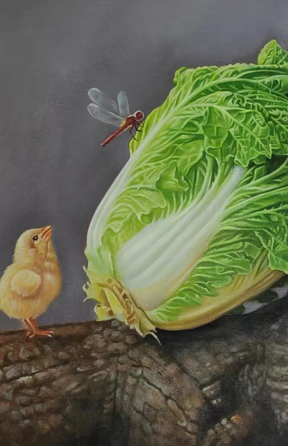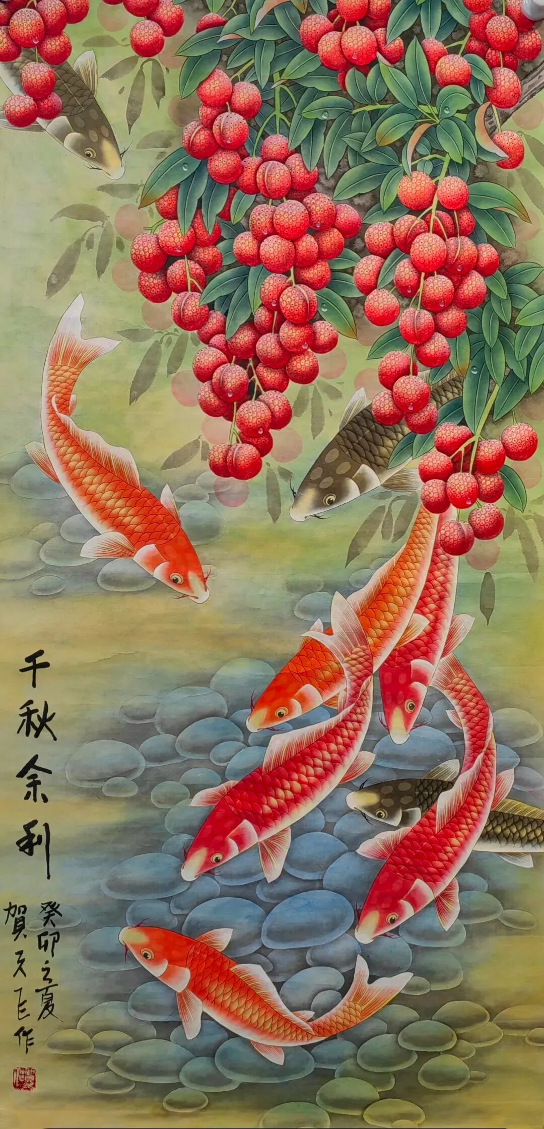 荔枝、葫芦、白菜等题材,是中国传统绘画中的经典母题,但在贺天飞笔下,它们被赋予了新的文化内涵。饱满的鲜红荔枝垂挂成串,翠绿叶子自然舒展,两只小鸟一展翅一啄食,羽毛色彩斑斓——这并非对“岭南佳果”的简单描摹,而是通过“荔枝”的“红”与“小鸟”的“动”,暗合“人间至味是清欢”的生活哲思。画中题款“人间最美得红利”更将“荔枝”从“果”升华为“福祉”的象征,传统题材由此承载起当代人对“美好生活”的向往。