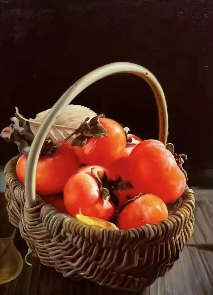 贺天飞的艺术不限于单一媒介,《红柿子》是一件典型的油画作品,蓝白瓷碗的釉面质感、红柿子的艳红与灰紫背景的冷调,通过油画的“厚堆法”与“薄涂法”形成层次;而《瀑布景观》则以水墨的“泼彩法”为主,黄褐色水流的奔腾与灰黑崖壁的厚重,通过水与墨的自然晕染实现“势”的贯通。这种“油画与水墨并行”的创作,本质上是贺天飞对“艺术语言普世性”的探索。