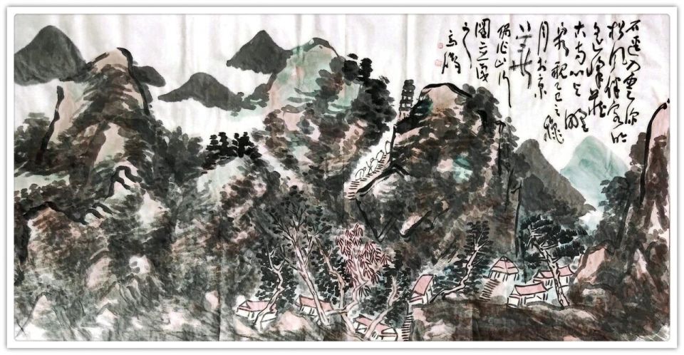 《云里藏寺》者,以高远深远之境,写山深寺隐之趣。层峦叠嶂间,古寺塔影若隐若现,山道行旅如蚁,衬天地之浩茫,显心迹之空寂。墨色浓淡干湿,皴擦点染,山石肌理苍润,林木葱郁含烟。近处屋舍红树,以淡彩点醒,于水墨氤氲中添人间烟火,又被远山空濛包裹,出世入世,浑然一体。右侧草书题跋,笔势奔放如流云,与画面静穆相映,既是意境之补白,亦是心境之直抒,尽显“书画同源”之深厚功力。