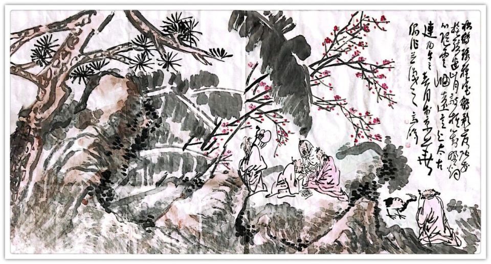 《春日雅集》者,承兰亭余韵,写林下风流。松梅之下,高士或对弈,或清谈,或观鹤,姿态悠然,神情自远;一鹤独立,更添清逸之气。苍松喻坚韧,红梅报春信,仙鹤寄高洁,传统符号并置,构建超越时空之精神乌托邦。人物以极简线条勾勒,形神兼备;山石以泼墨破墨之法,气势开张。“以形写神”之间,既有视觉张力,又不失文人画之含蓄内敛,实为对士人精神的深情回望。