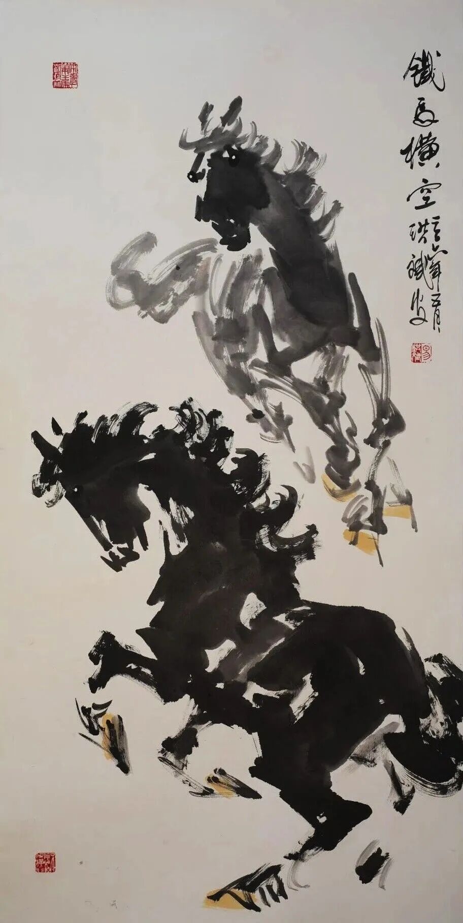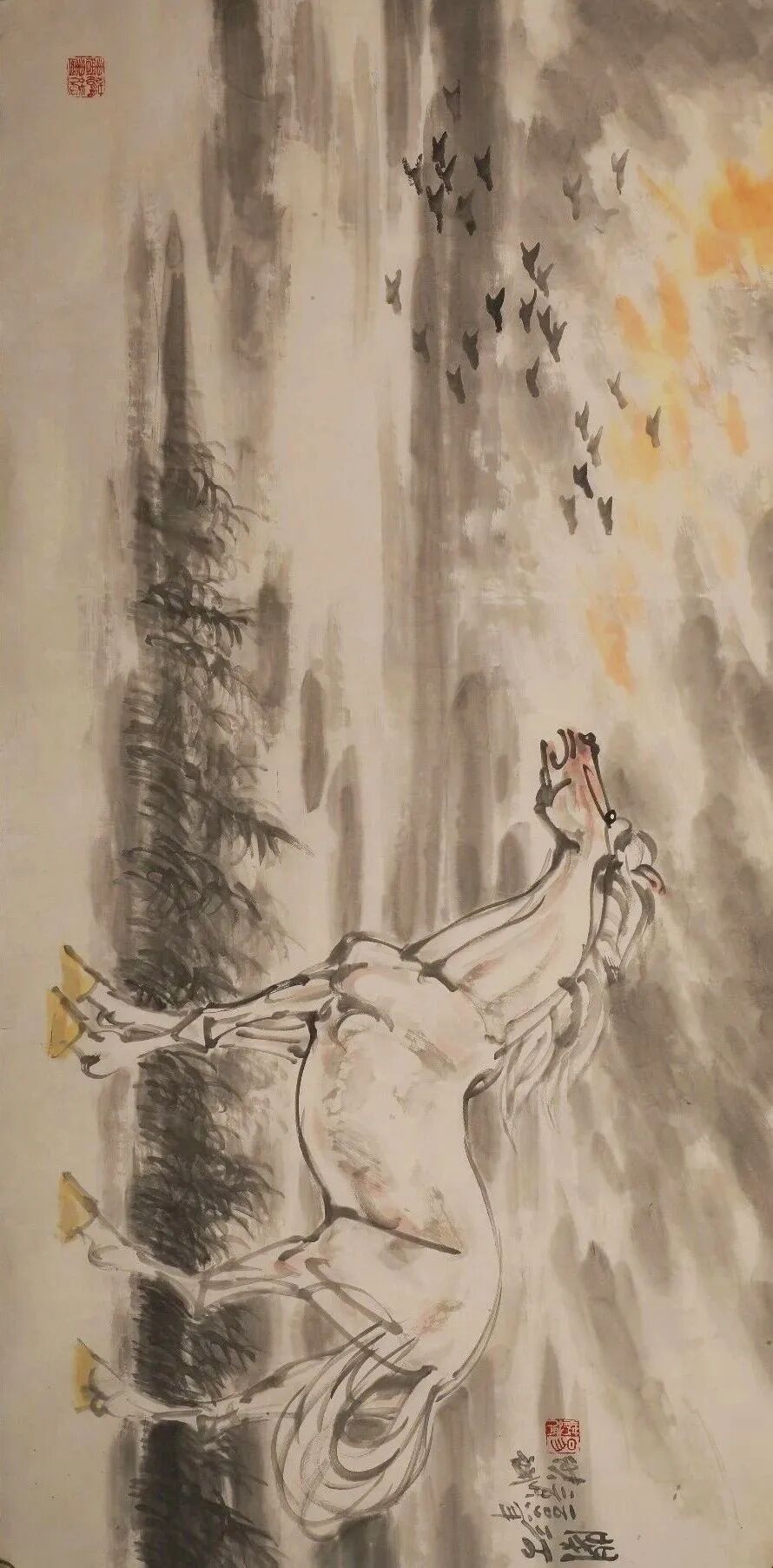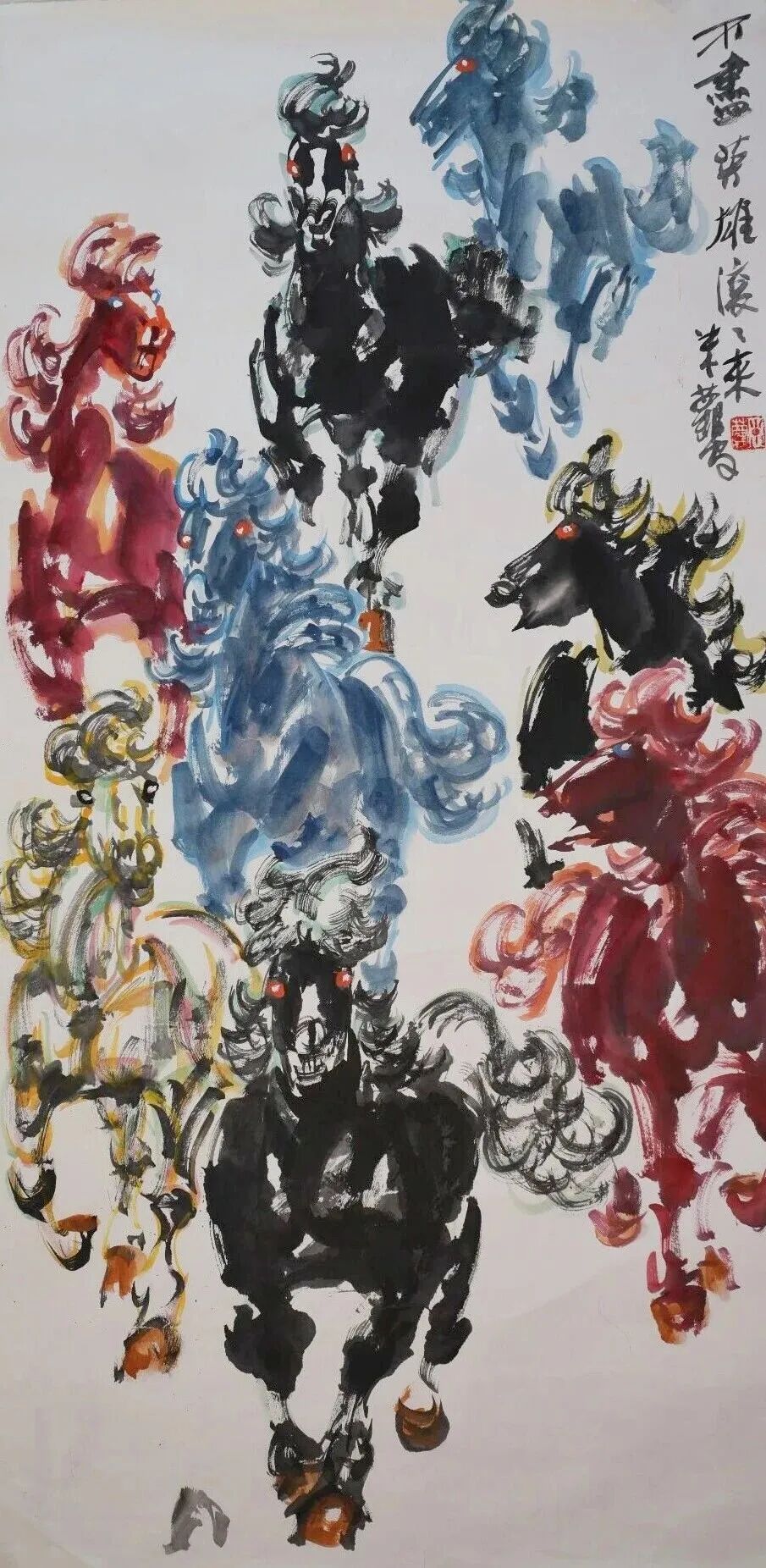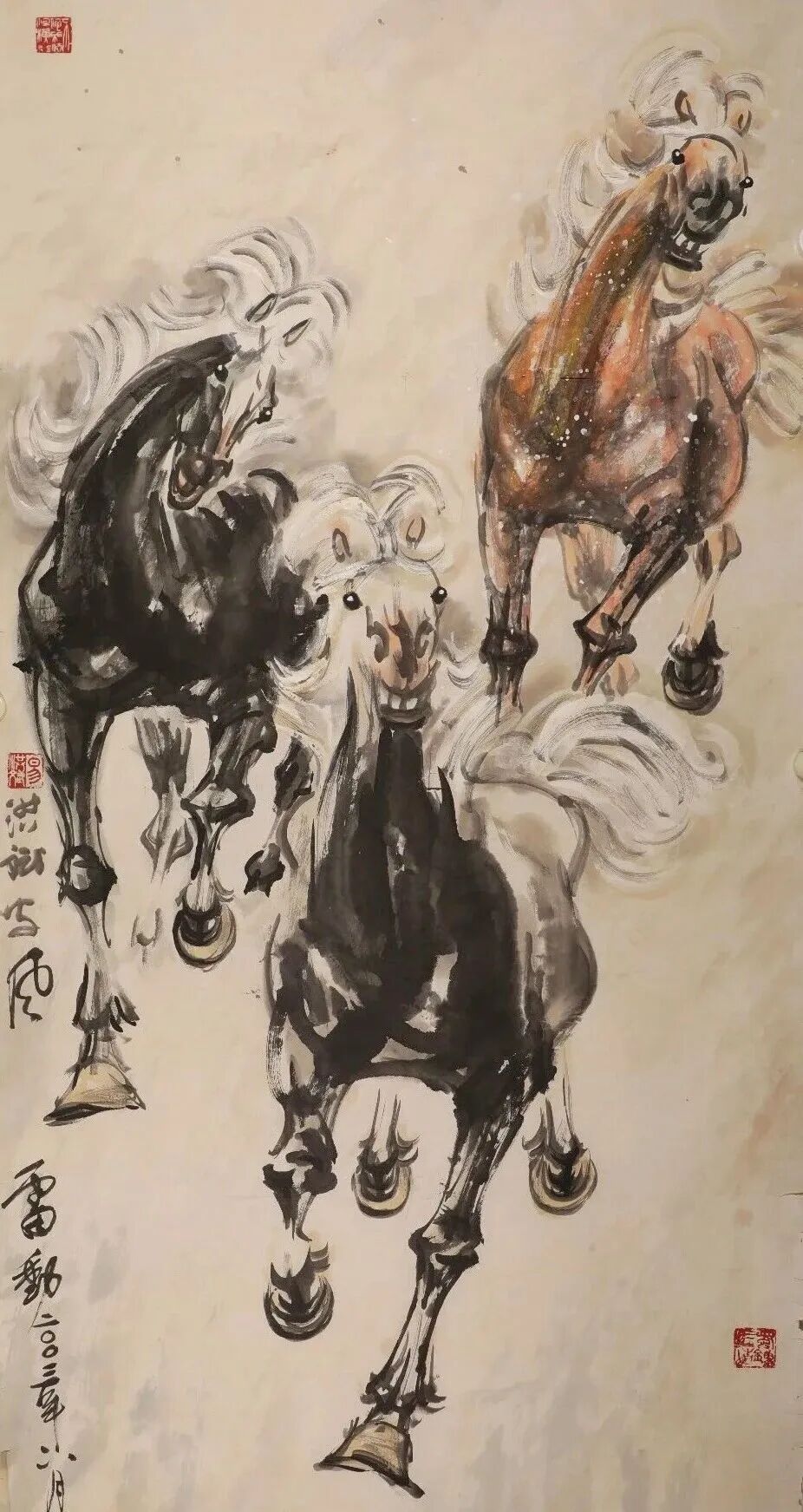 他是一位艺术修养全面的画家,但他把艺术精神最终凝练、赋予了马的形象。他最先感悟于战马的磅礴力量,甚至认为英雄和战马共同铸就了历史的辉煌,亦曾推动时代的走向。在他的笔下,马的面部造型如龙,婉转悠扬的用笔精妙塑造出马与土地、马与风云的内在联结,形成了不同时代的龙马精神。