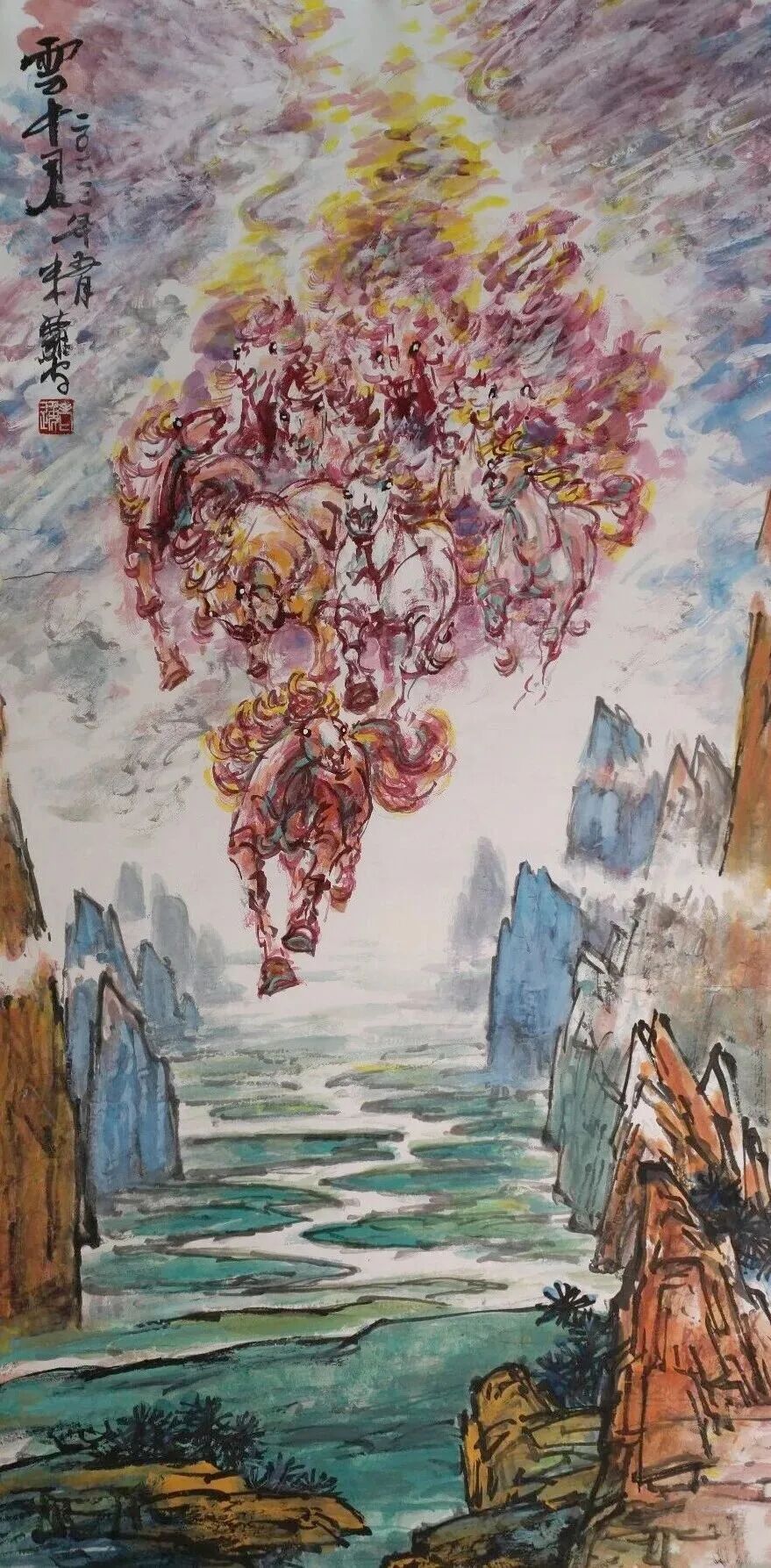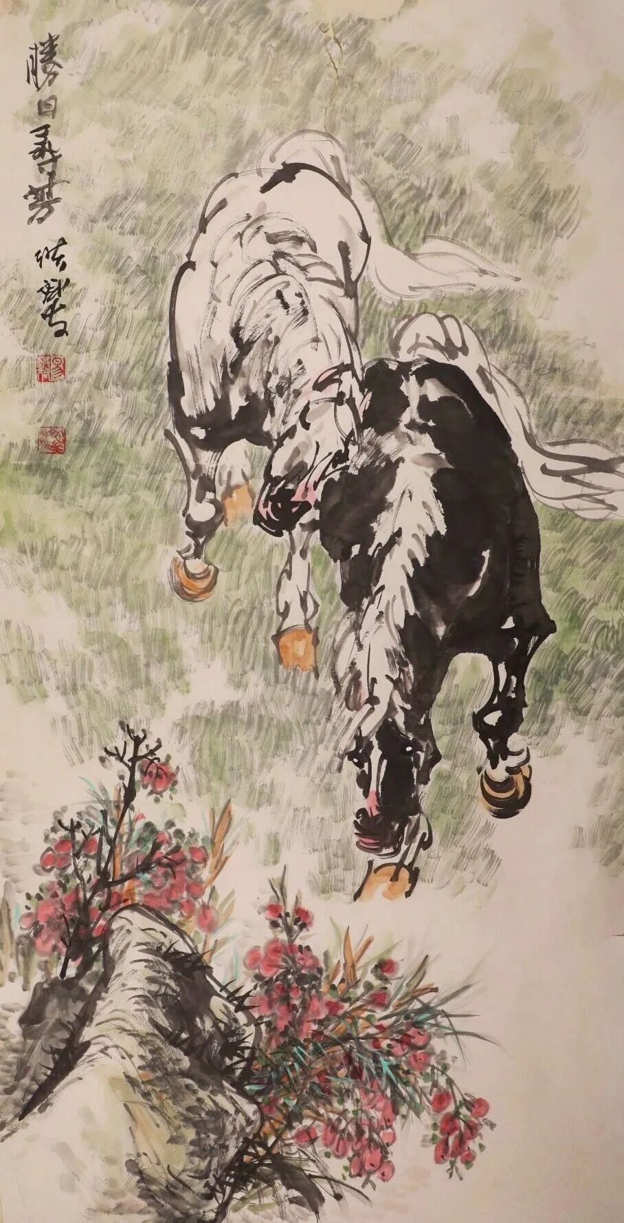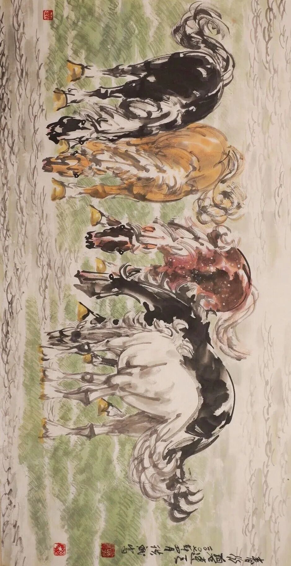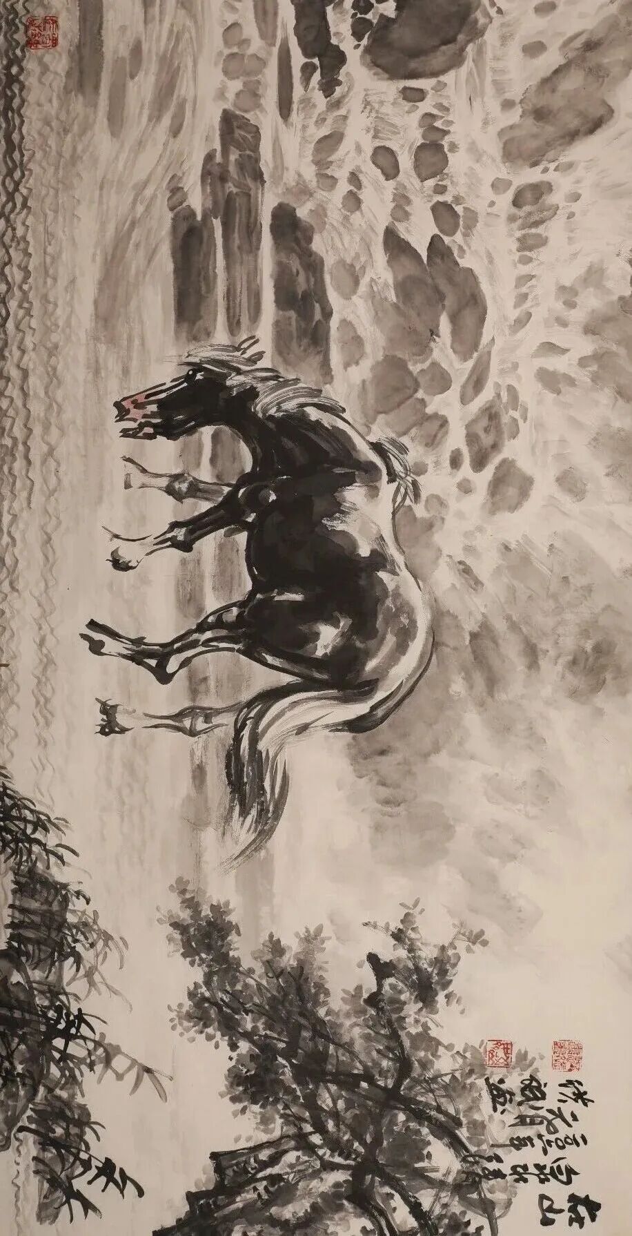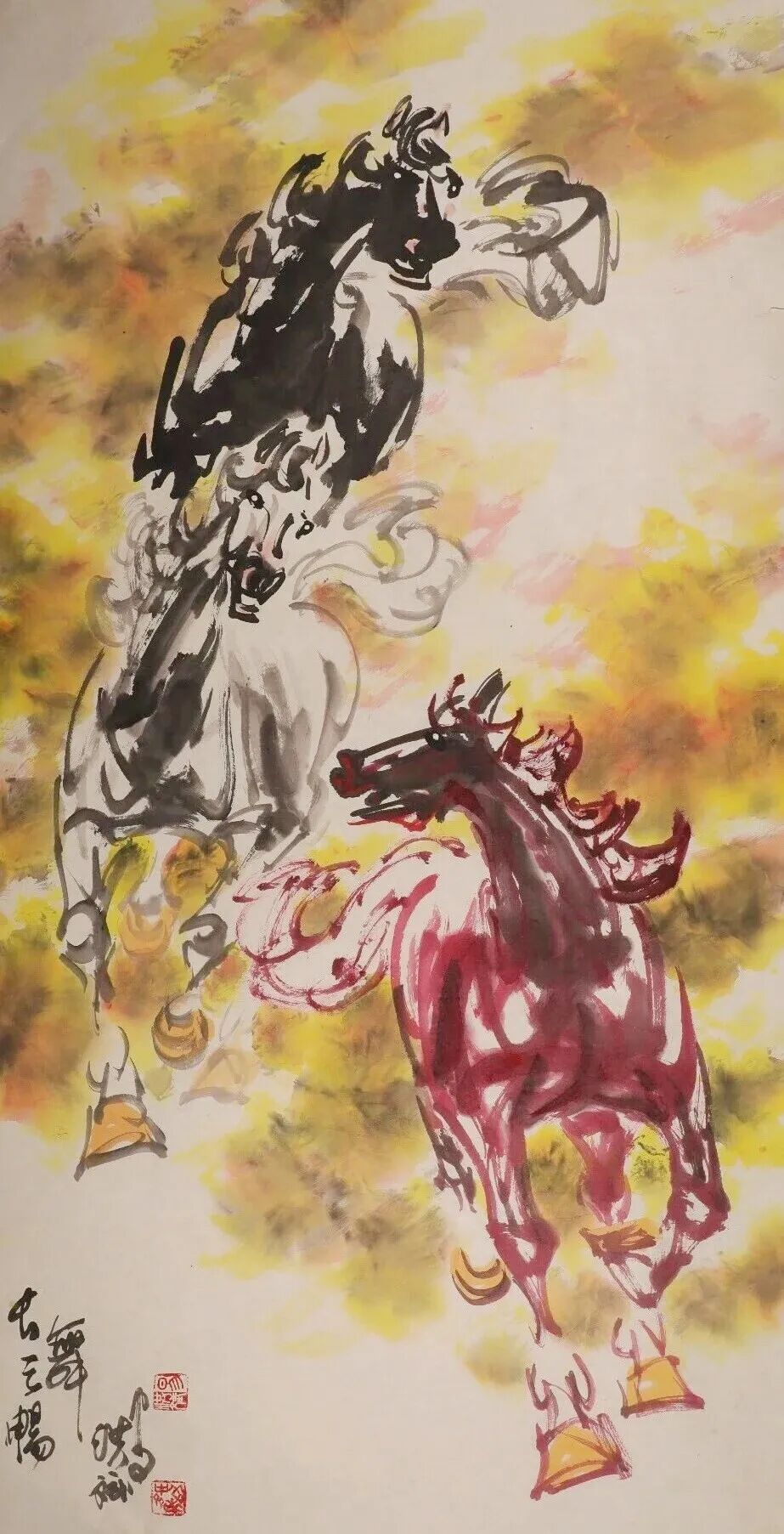 他是一位艺术修养全面的画家,但他把艺术精神最终凝练、赋予了马的形象。他最先感悟于战马的磅礴力量,甚至认为英雄和战马共同铸就了历史的辉煌,亦曾推动时代的走向。在他的笔下,马的面部造型如龙,婉转悠扬的用笔精妙塑造出马与土地、马与风云的内在联结,形成了不同时代的龙马精神。