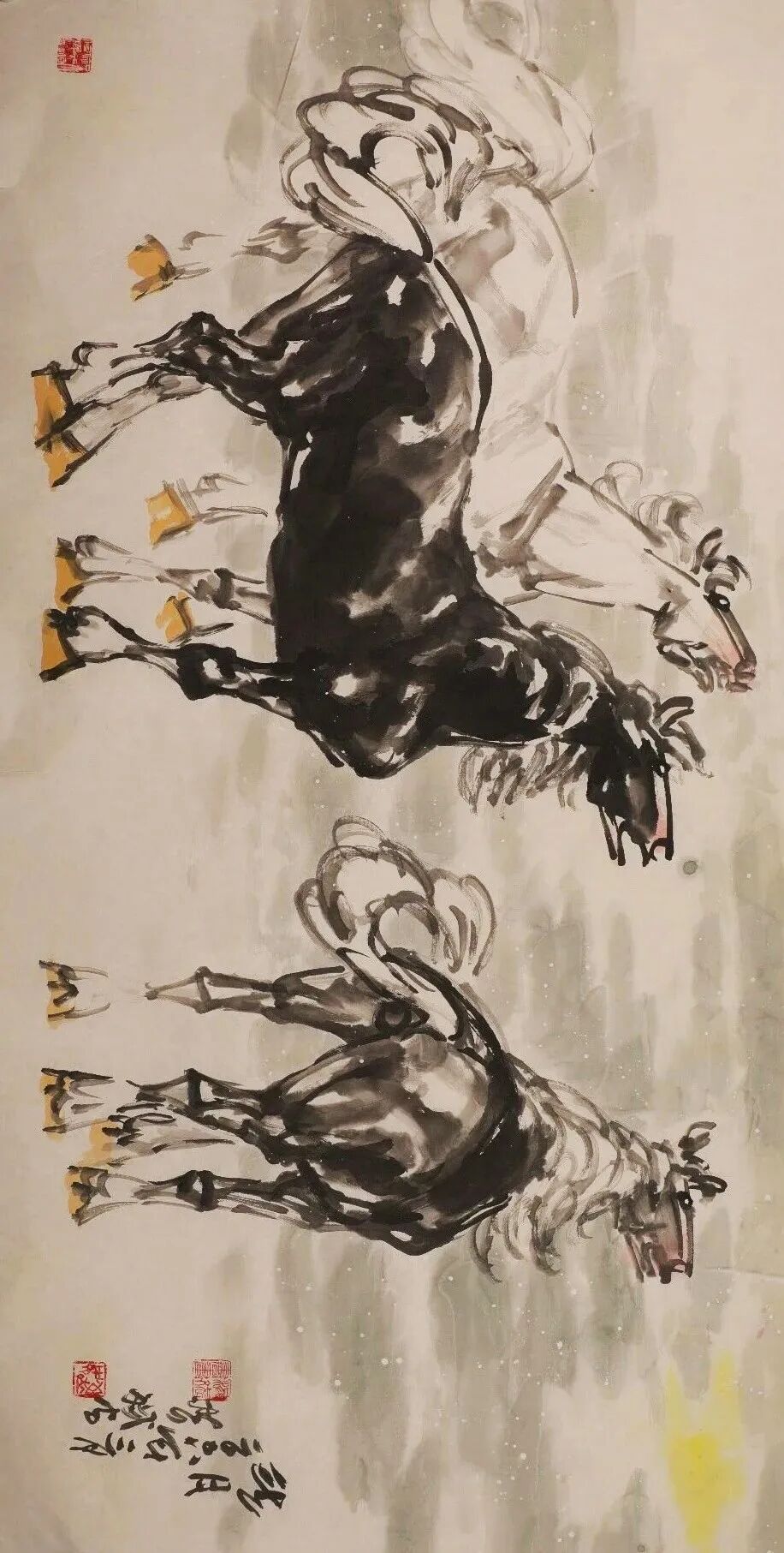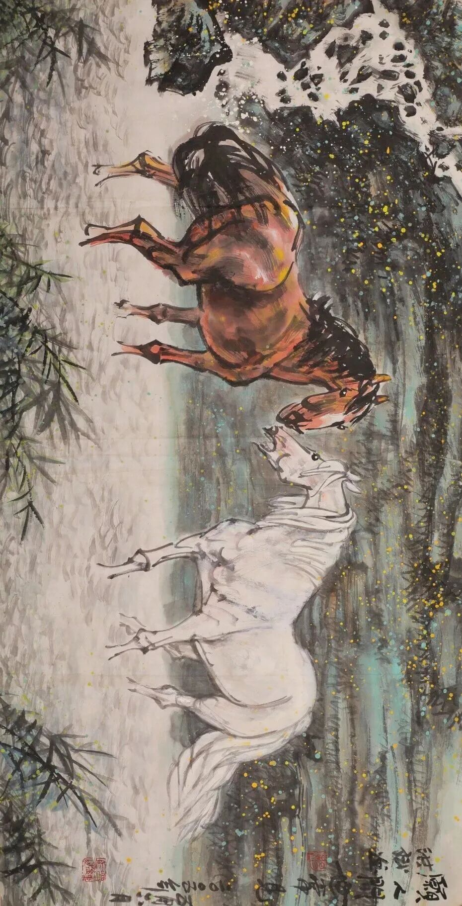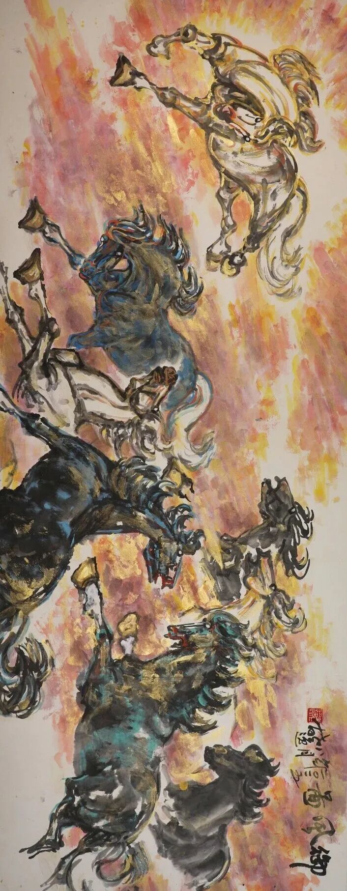 他笔下的“马”,从艺术构思而言是属于沧桑悲壮的美学精神的,他的艺术手法是浪漫积极的,二者的完美融合,成就了他的艺术形象的独立性和唯一性。他的创作思维完全契合艺术哲学的逻辑,这在当代画家中也是不多见的。我们常常感叹艺术创新之艰、之难,其关键在于,我们不能仅仅在艺术本体上进行固化的思维。