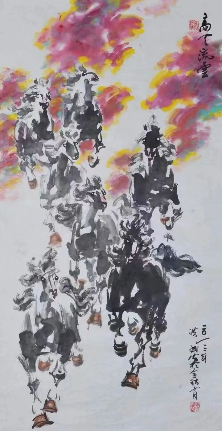 在他一系列的绘画作品中,如《三人行》《八骏排雪图》《畅舞长空》《忽忽跨九州》,无论是诗情画意的“三人行”,还是横空夺云的“八骏”“畅舞”,皆是时代精神的物化表达,令人于笔墨间感受到风云变幻中的社会变革。