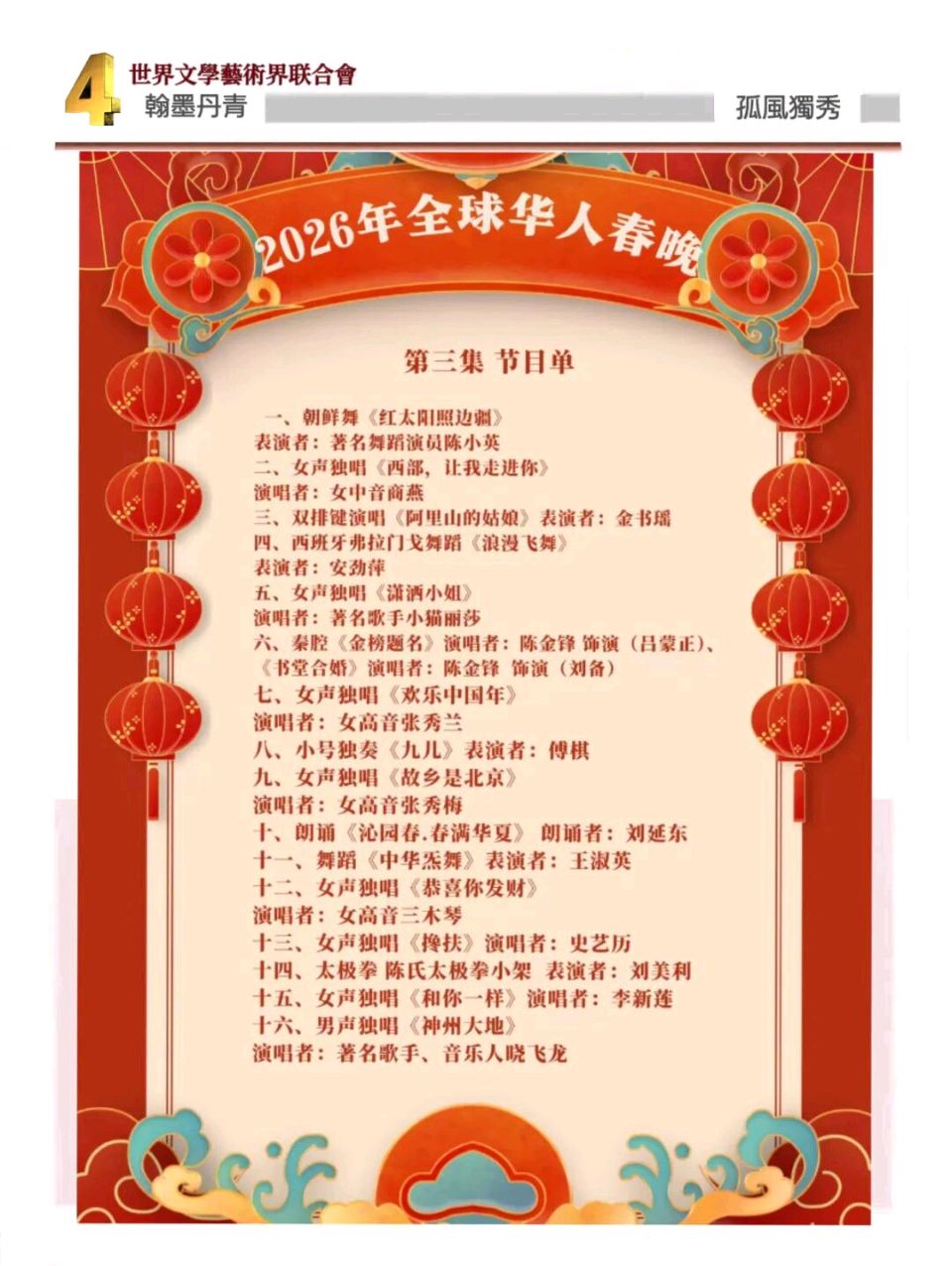 《2026年全球华人春晚》第一集(节目六《颂歌献给共产党》首唱:张帆)‖树人 劲松险峰