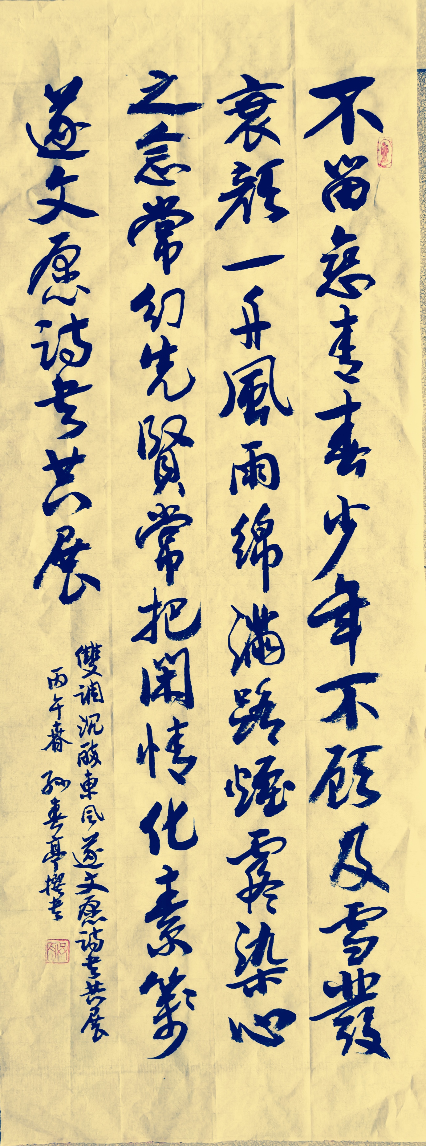 在元曲里,〔双调·沉醉东风〕是个最接地气的曲调,韵律明快、语言实在,文人常用来写自己的心里话、寄托自己的情怀。 张养浩的《[双调·沉醉东风]因此上功名意懒》,借着时光过得快、世事无常的感慨,放下了对功名利禄的执念,变得淡泊从容。孙春亭先生,照着他的曲调和韵脚,写了《[双调·沉醉东风]遂文愿诗书共勉》,是写在读书写字中找到乐趣,晚年追逐文人心愿的热情和坚持。